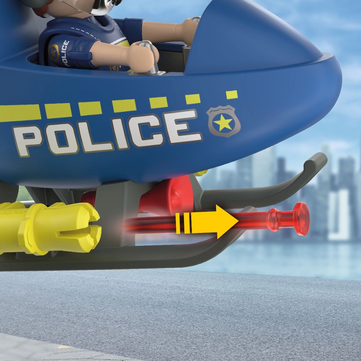 Zestaw PLAYMOBIL City Action wnosi do pokoju dziecięcego mnóstwo dynamiki. Śmigłowiec z obracającymi się rotorami umożliwia płynne manewry, podczas gdy policjant patroluje okolicę, nadaje komunikaty przez megafon i oddaje bezpieczne strzały ostrzegawcze. Dzieci z łatwością stworzą własne opowieści pełne napięcia i przygód.