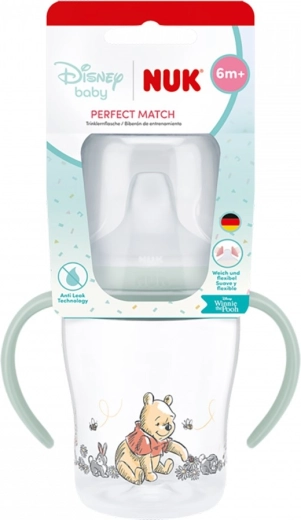 Butelka treningowa NUK Perfect Match z motywem DISNEY Kubusia Puchatka o pojemności 150 ml pomaga dzieciom naturalnie przejść z butelki na kubeczek. Ma wyjątkowo miękki i elastyczny ustnik z szerokim podparciem dla warg, ergonomiczne, antypoślizgowe uchwyty ułatwiające chwyt, technologię Anti‑Leak przeciw wyciekaniu oraz wskaźnik temperatury dla bezpiecznego podawania napoju. Wyprodukowano w Niemczech z wysokiej jakości materiałów.