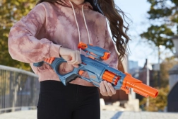 Wyjątkowość blastera podkreślają 3 szyny taktyczne do podłączania dodatkowych akcesoriów (sprzedawane oddzielnie). Nie wymaga baterii, zalecamy użycie okularów ochronnych (brak w zestawie).