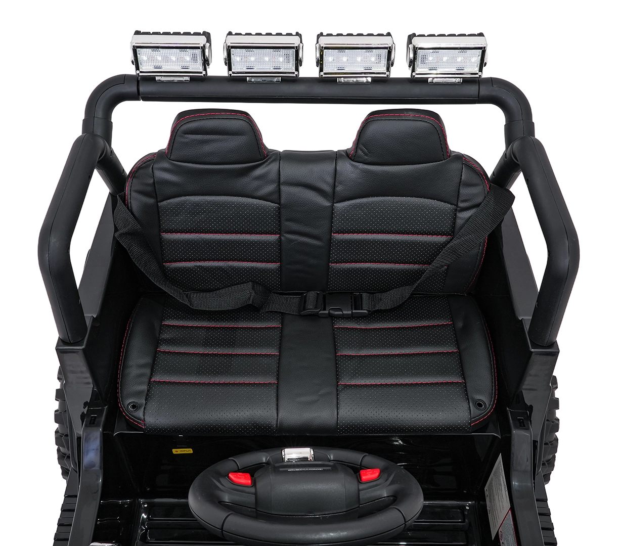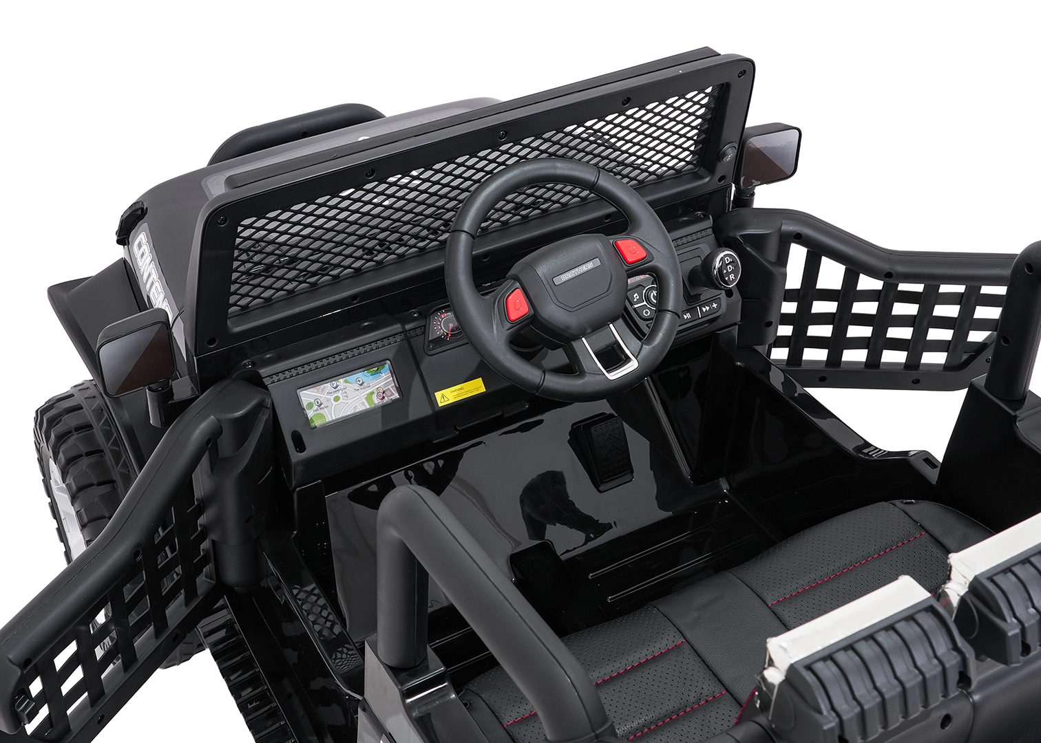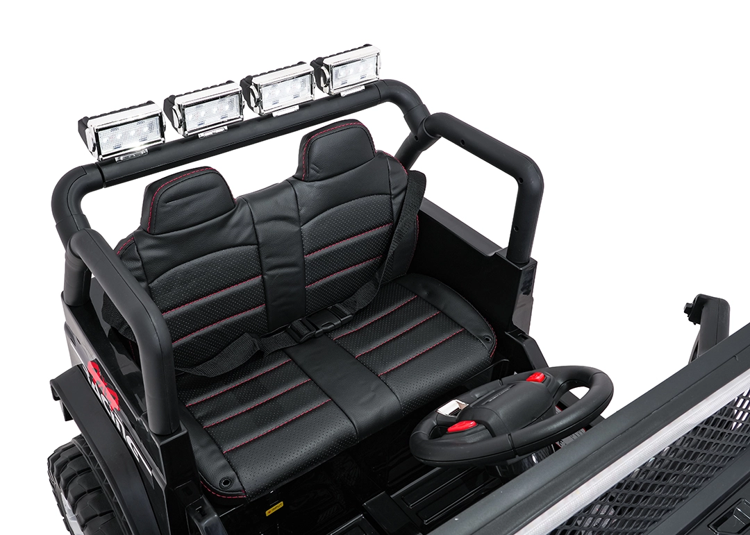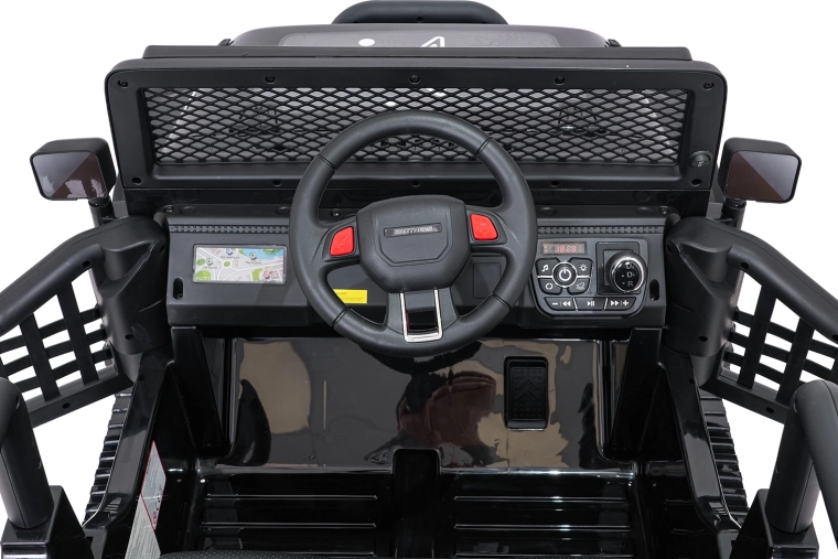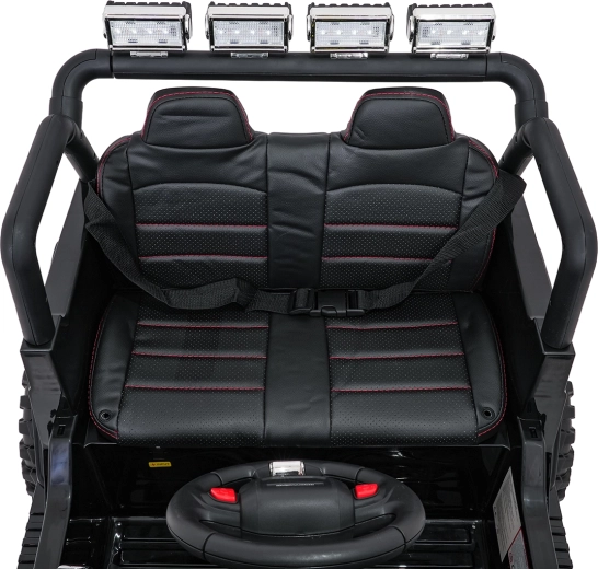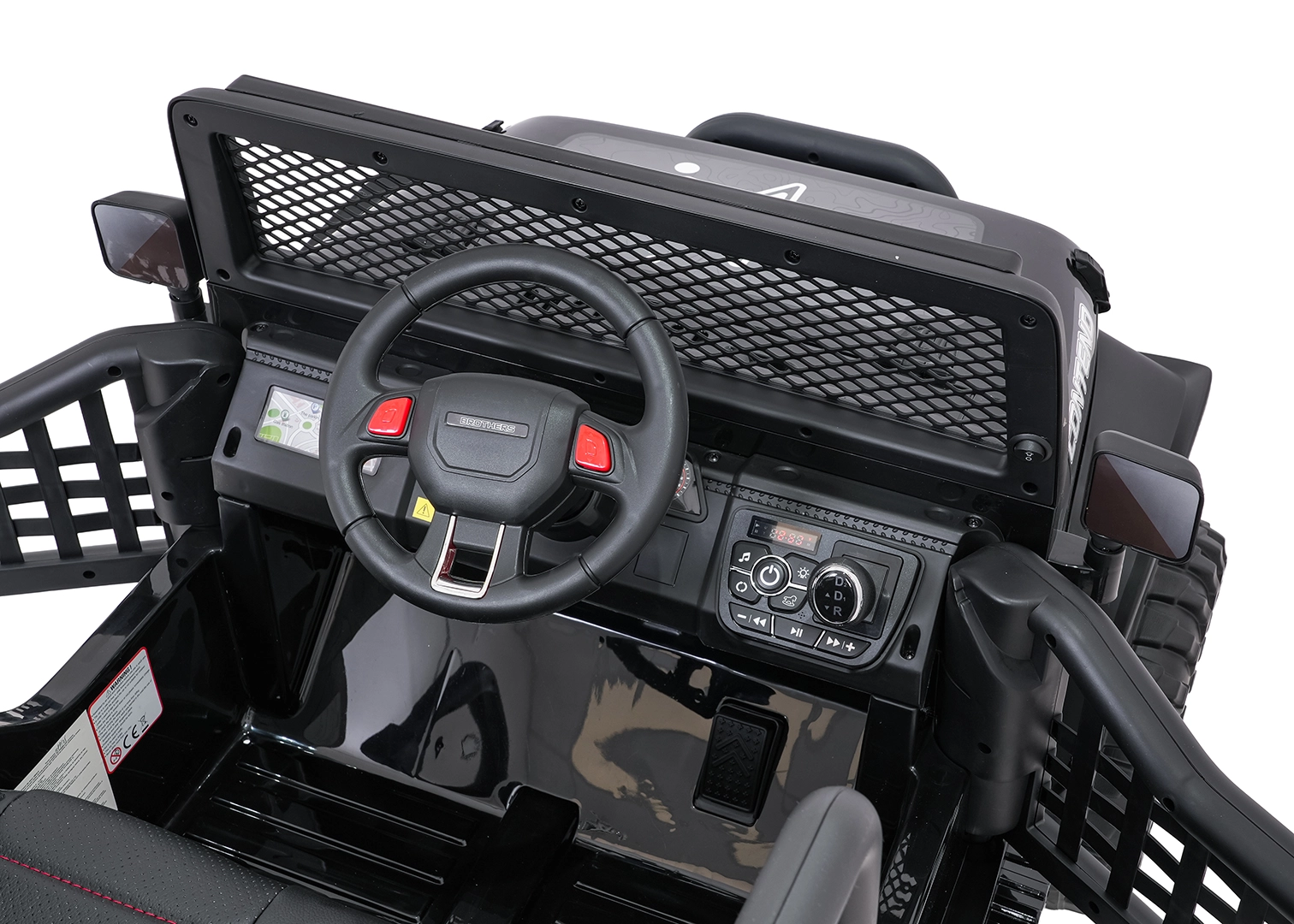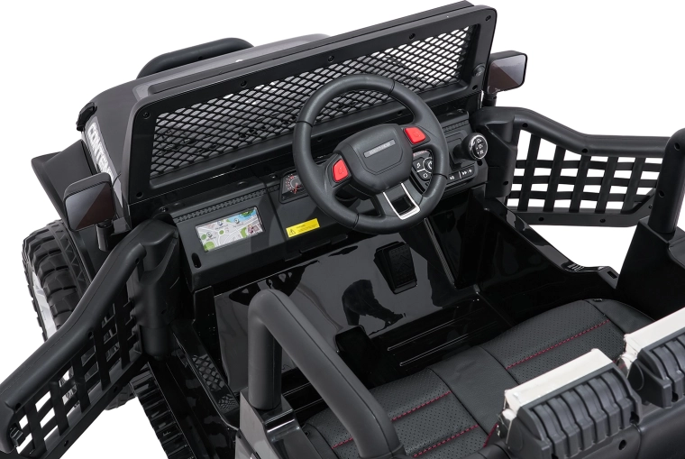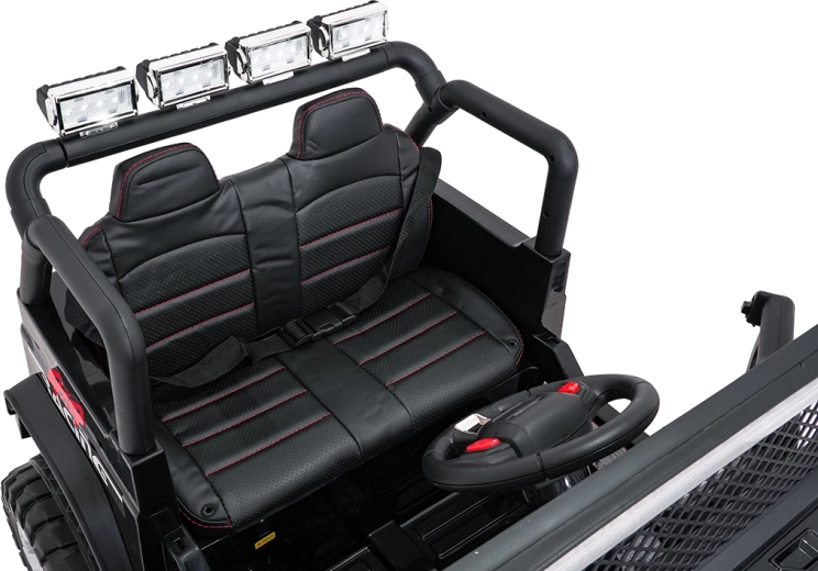 Podwójne siedzisko z ekoskóry z pasami bezpieczeństwa zapewnia przestrzeń i wygodę. Rodzice docenią pilot 2,4 GHz z trzema prędkościami i awaryjnym przyciskiem Stop. Małych kierowców ucieszy panel multimedialny z radiem FM, MP3, USB, AUX i Bluetooth, przyciskami dźwięków i klaksonem na kierownicy oraz wskaźnikiem naładowania akumulatora.