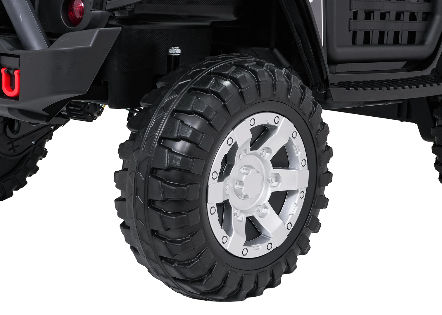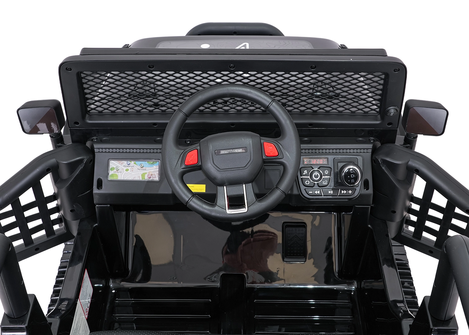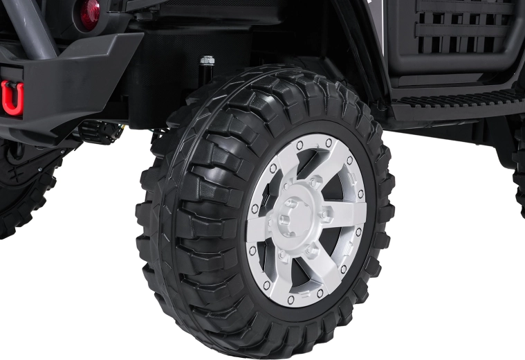 Solidny dziecięcy elektryczny samochodzik w stylu terenowego jeepa oferuje mocny napęd 4x4 (4×45 W), podwójny akumulator 2× 12 V 7 Ah, miękkie koła EVA oraz przednie i tylne zawieszenie dla komfortowej jazdy. O bezpieczeństwo i frajdę dba zdalne sterowanie 2,4 GHz z przyciskiem Stop, oświetlenie LED oraz bogaty panel audio z Bluetooth, MP3 i radiem FM.