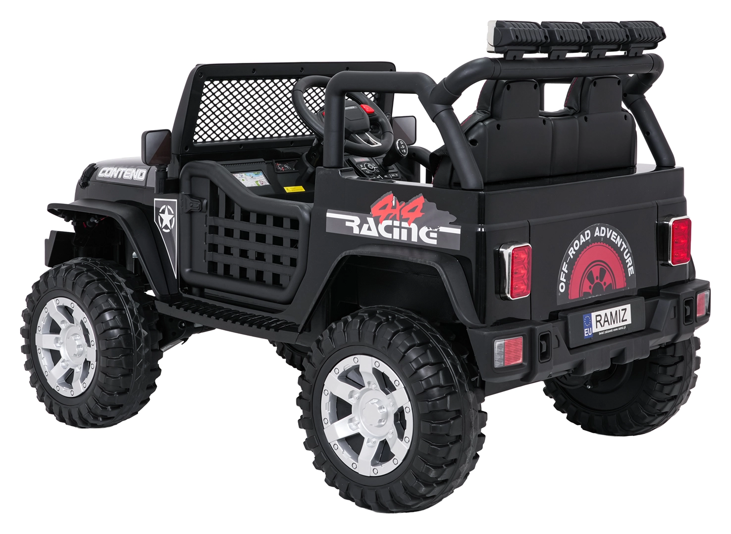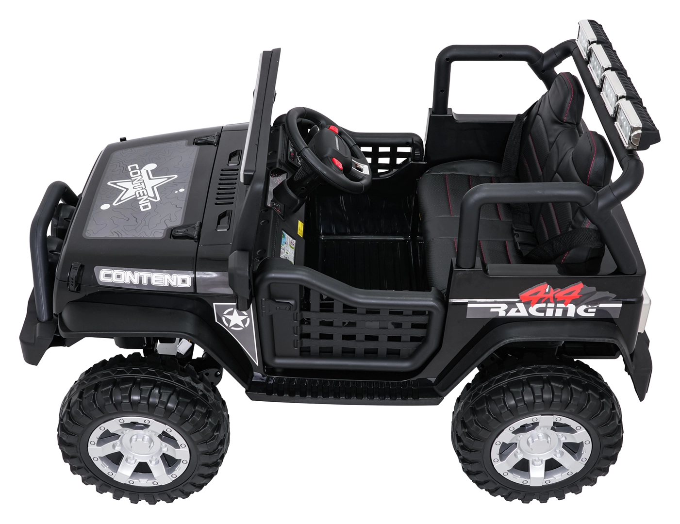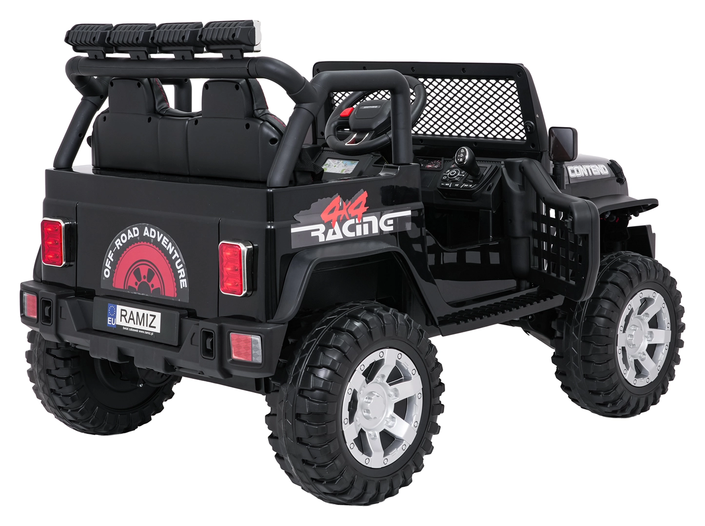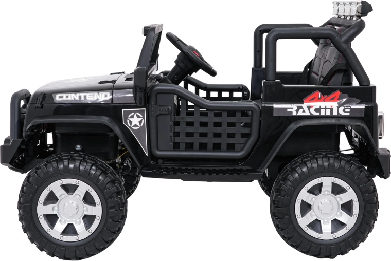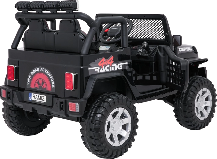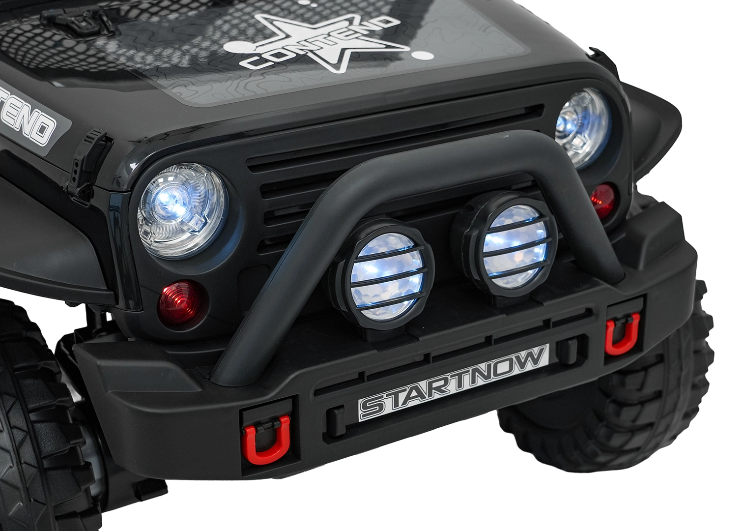 Ten czarny terenowy champion stworzony jest do przygód. Dzięki napędowi na cztery koła 4x4, wysokiemu prześwitowi i miękkim kołom EVA pokona nierówności i ogrodowy teren. Płynny start, dwa biegi oraz jazda do przodu/tyłu zapewniają wygodne i bezpieczne sterowanie. Oświetlenie LED (przednie, tylne i dachowa belka) dodaje realistycznego wyglądu i lepszej widoczności.