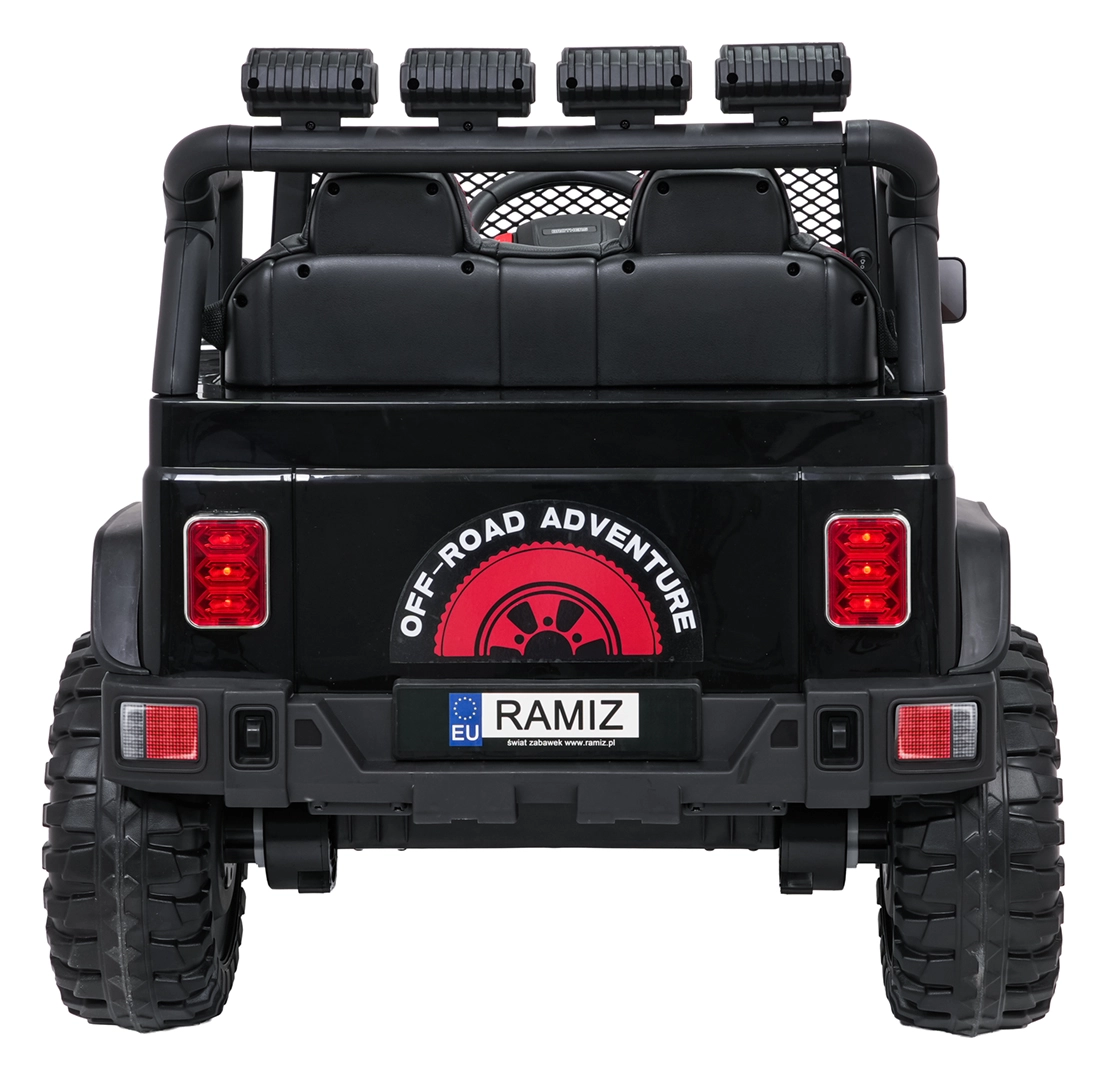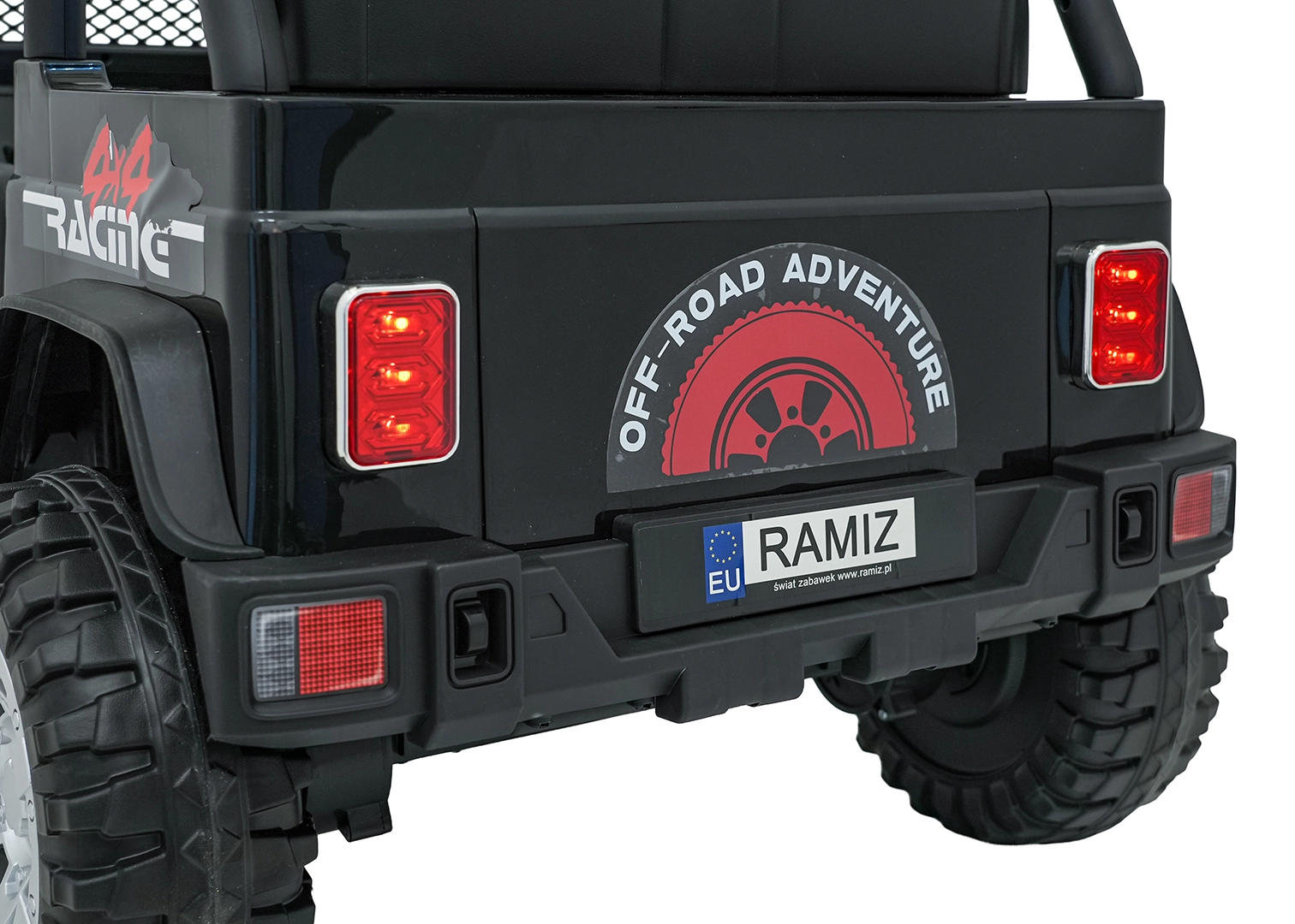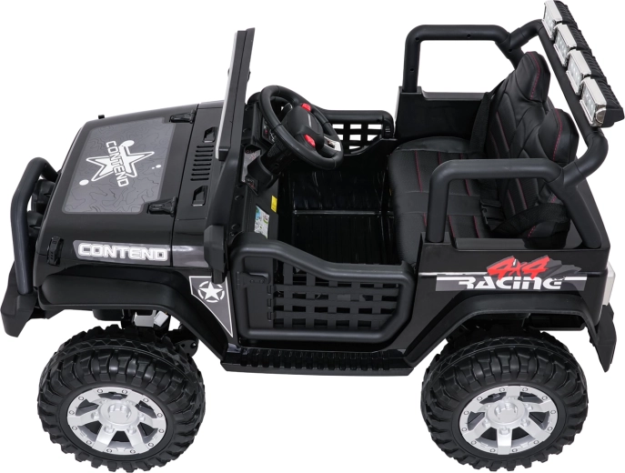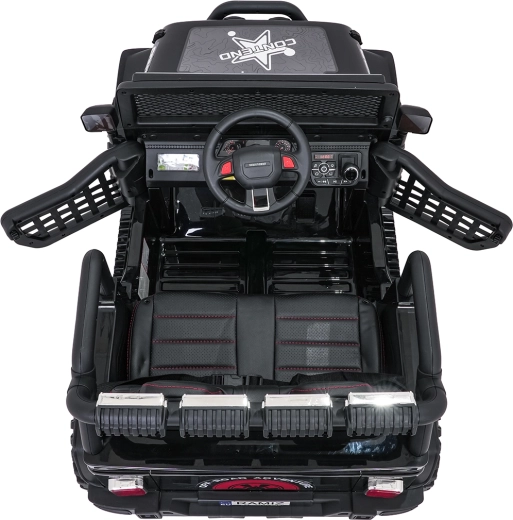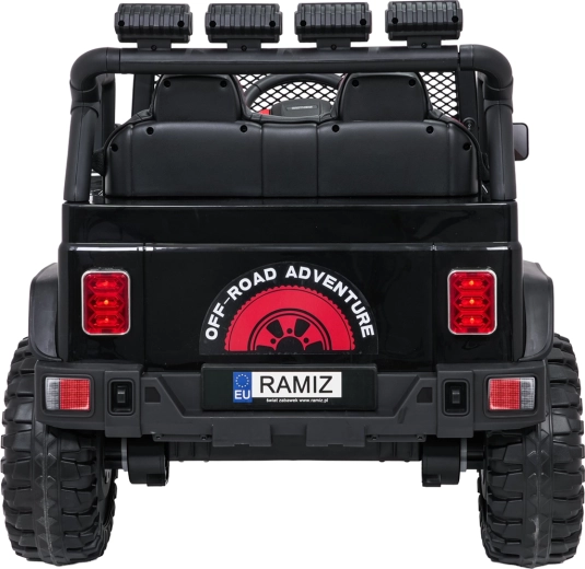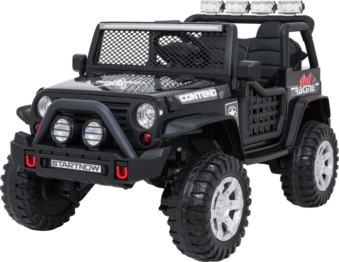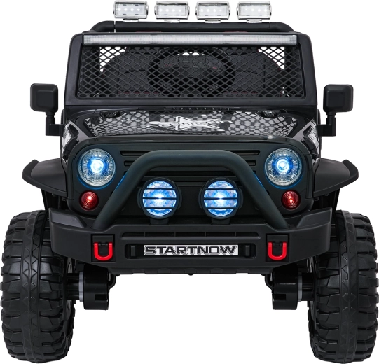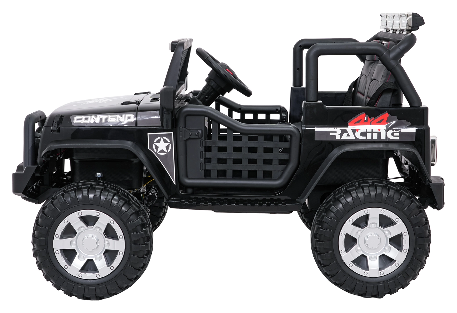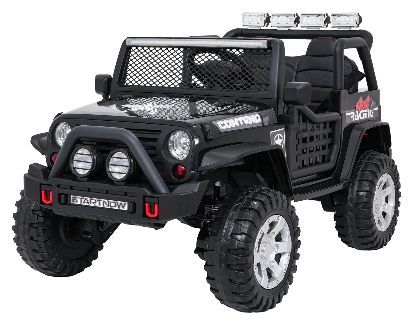 Ten czarny terenowy champion stworzony jest do przygód. Dzięki napędowi na cztery koła 4x4, wysokiemu prześwitowi i miękkim kołom EVA pokona nierówności i ogrodowy teren. Płynny start, dwa biegi oraz jazda do przodu/tyłu zapewniają wygodne i bezpieczne sterowanie. Oświetlenie LED (przednie, tylne i dachowa belka) dodaje realistycznego wyglądu i lepszej widoczności.