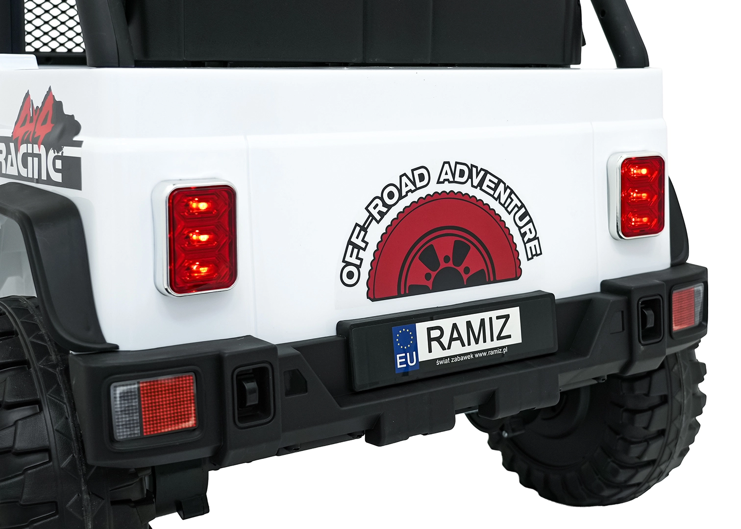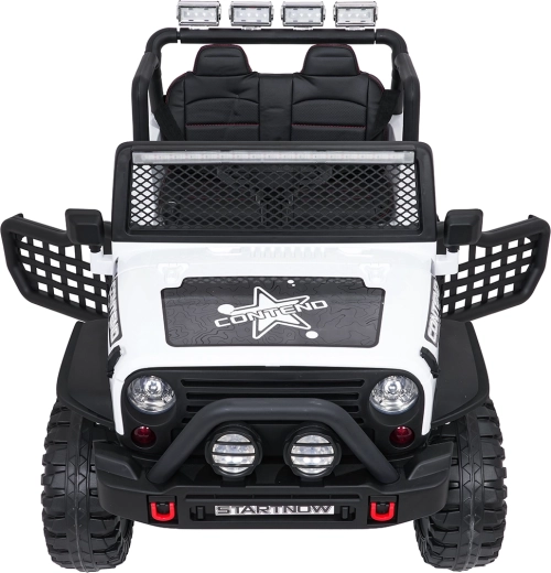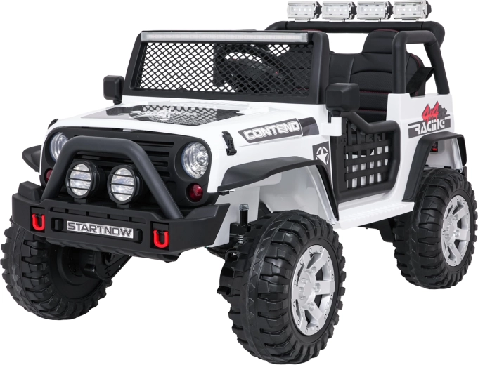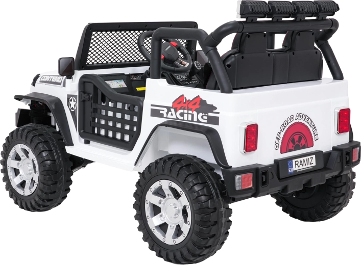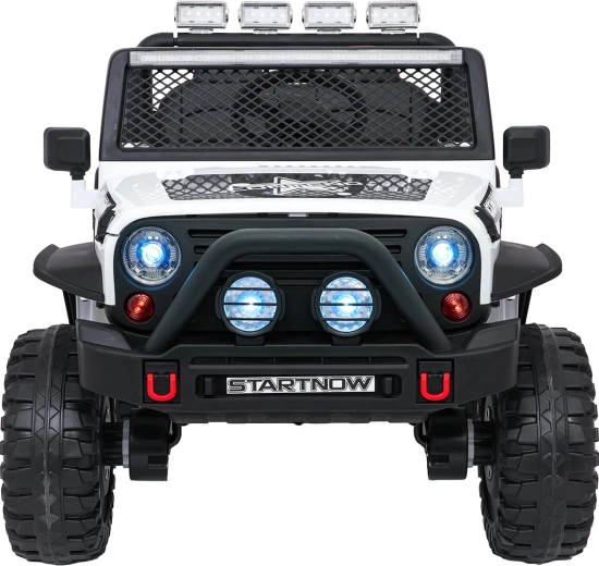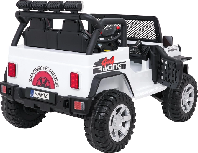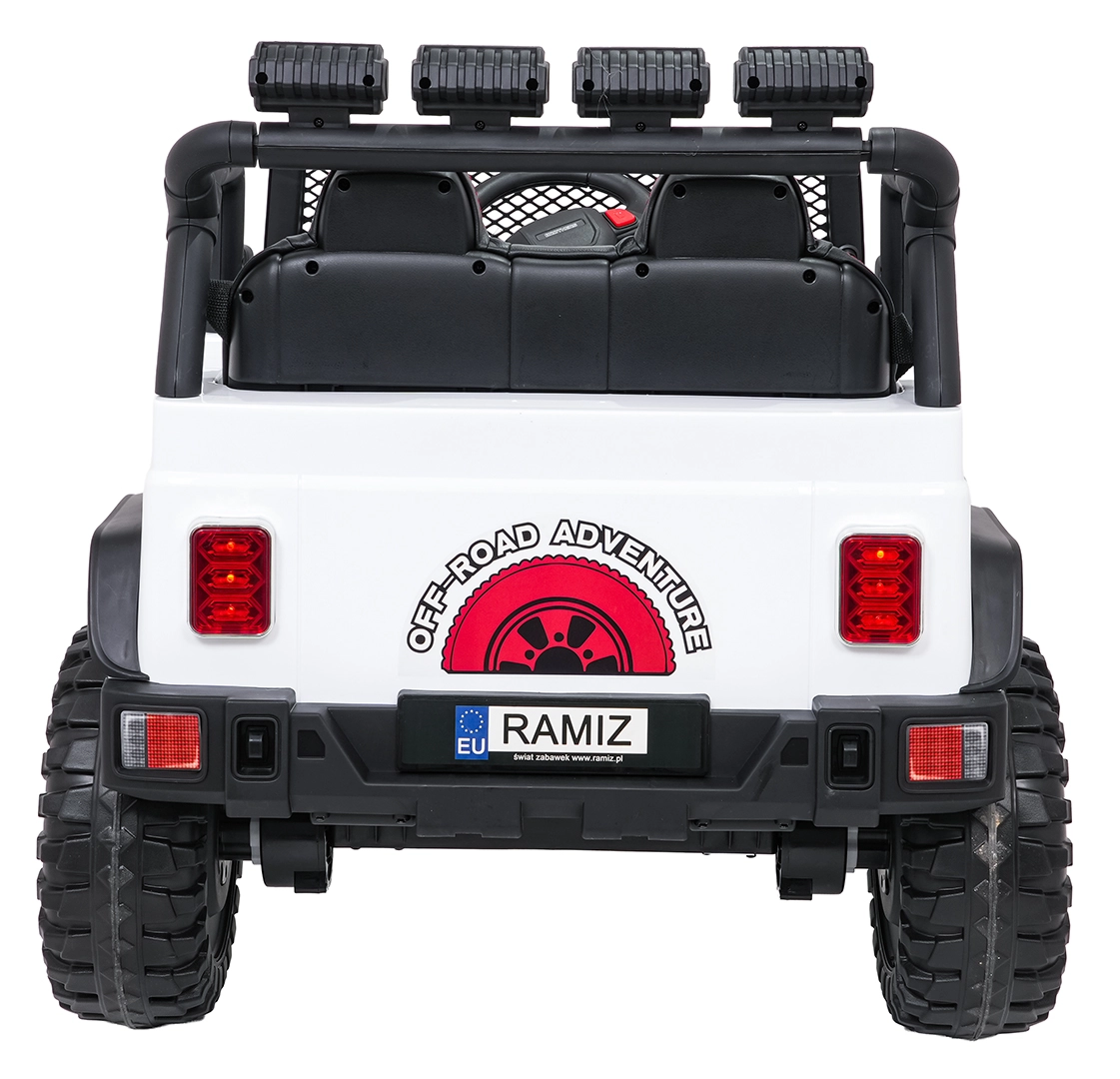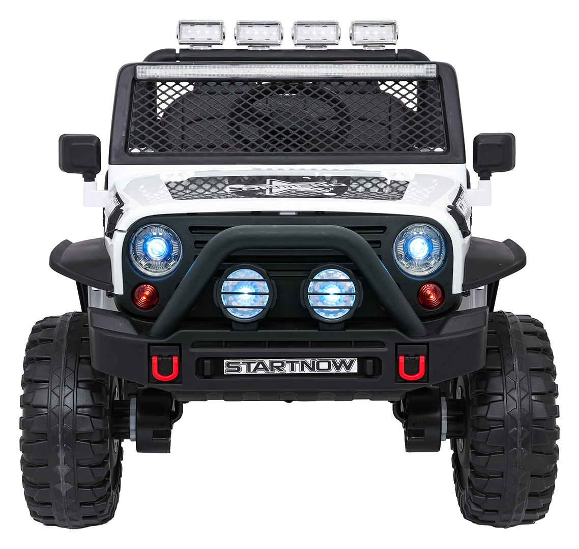 Odkryj przygodę z białym jeepem BEAST 4x4 – towarzyszem na ogród i nieutwardzone drogi. Dzięki czterem silnikom 45 W, podwójnemu akumulatorowi 12 V 7 Ah oraz miękkim kołom EVA radzi sobie z płynnym ruszaniem i nierównym terenem. Nie brakuje przednich i tylnych świateł LED ani świetlnej rampy na dachu, które podkreślają realistyczny off‑road wygląd.