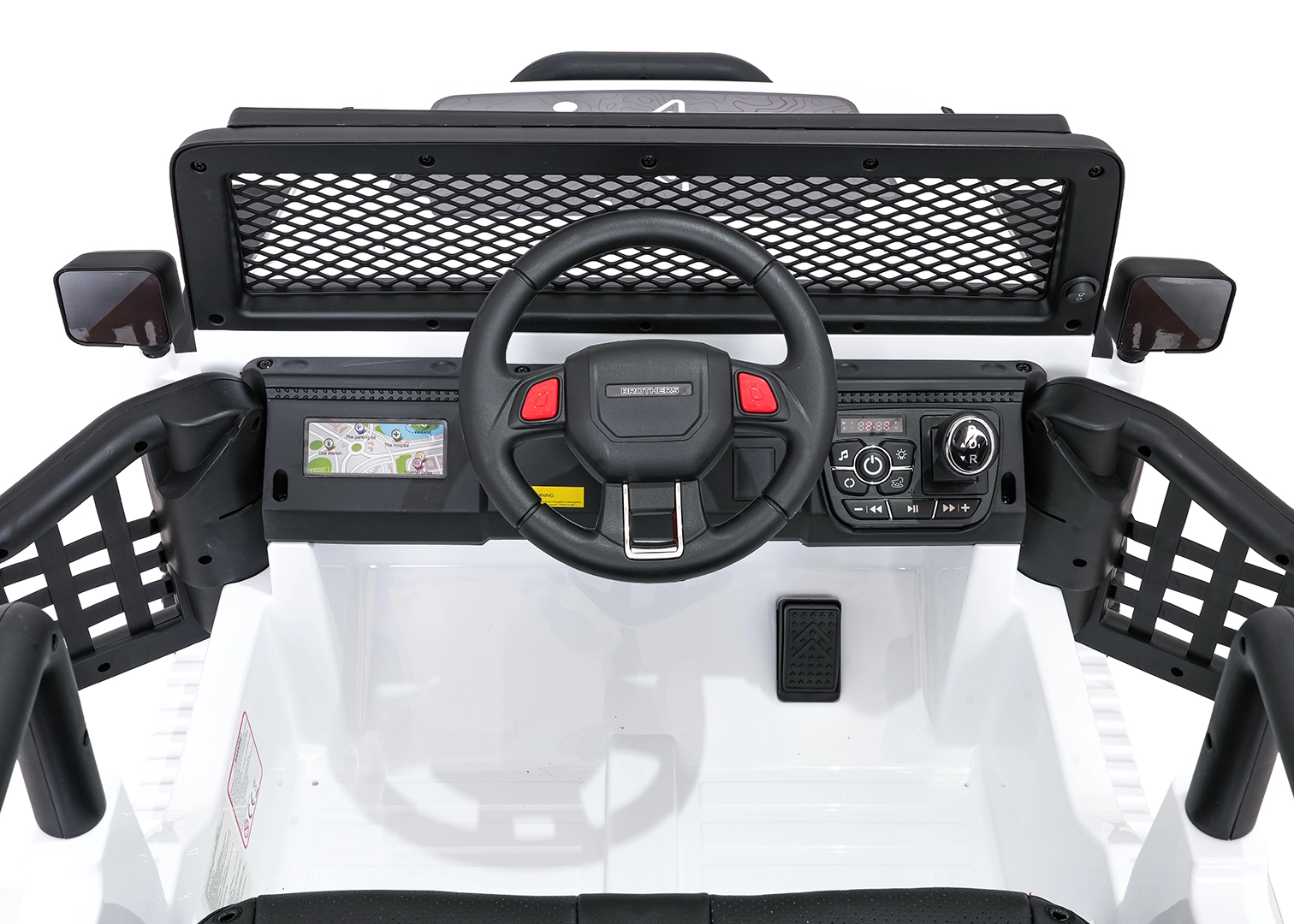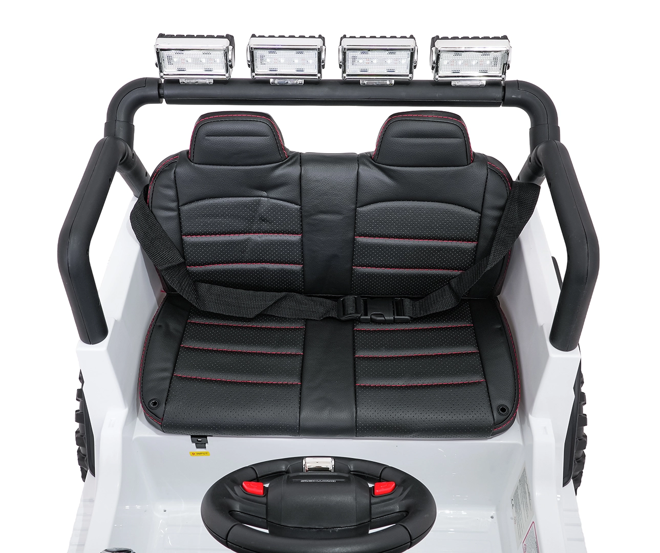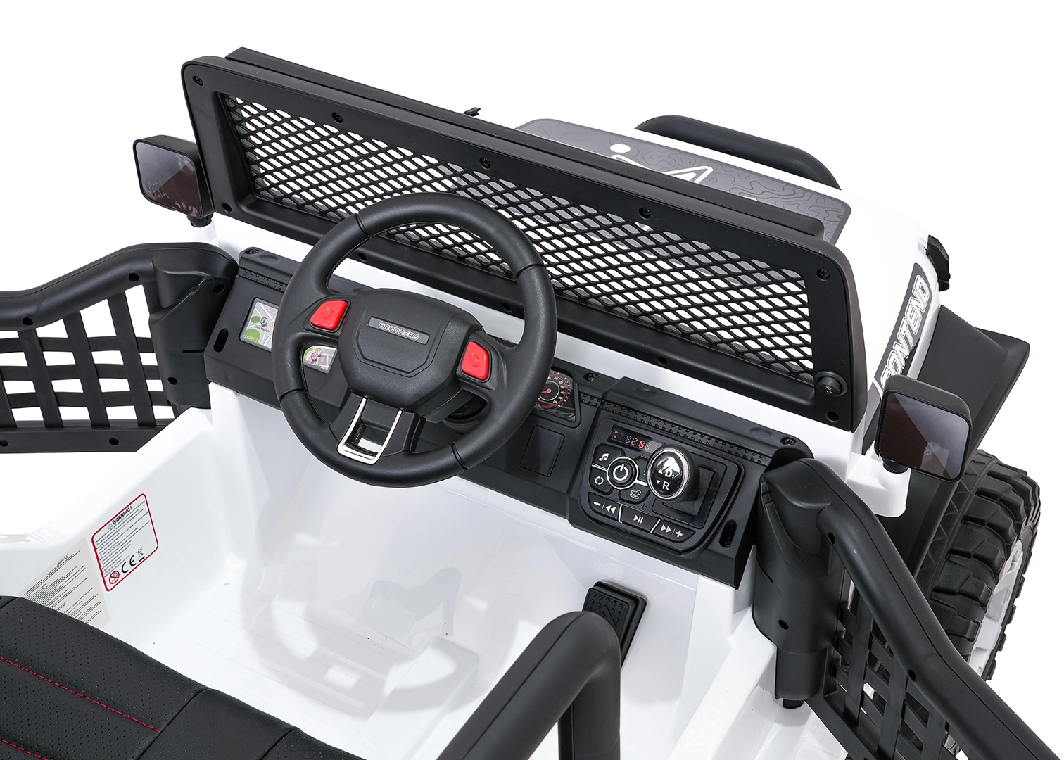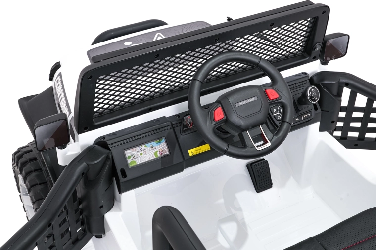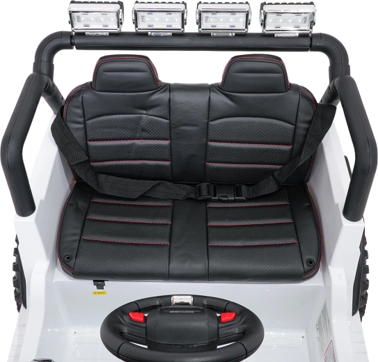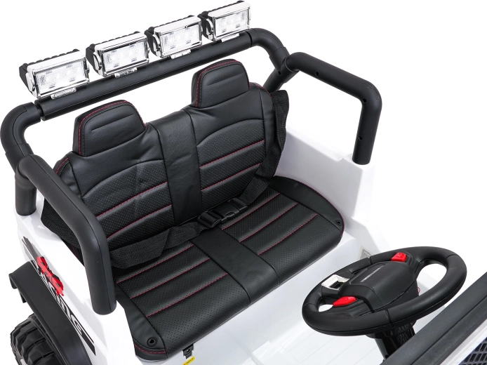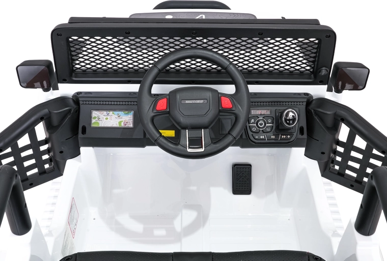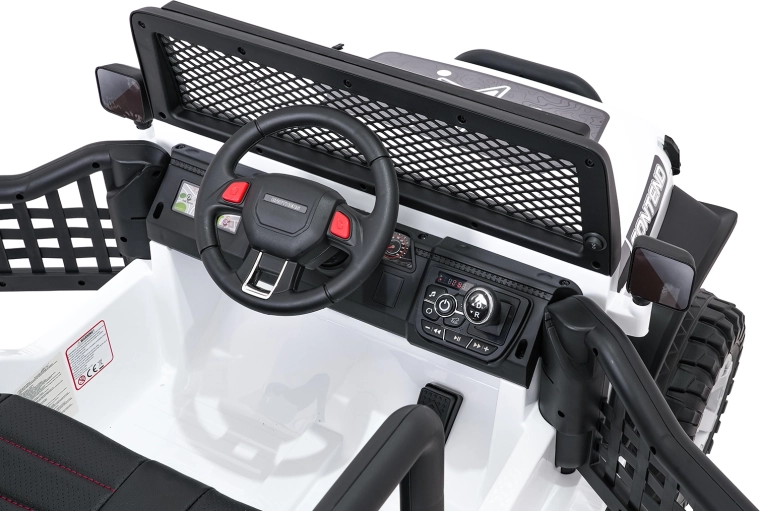 Bezpieczeństwo zapewniają pasy bezpieczeństwa, otwierane drzwi oraz zdalne sterowanie 2,4 GHz z przyciskiem awaryjnego zatrzymania STOP. Dzieci ucieszy komfortowe siedzisko z ekoskóry i bogate funkcje audio: Bluetooth, USB, AUX, MP3, radio FM, dźwięki i klakson na kierownicy. O energii informuje wskaźnik naładowania.