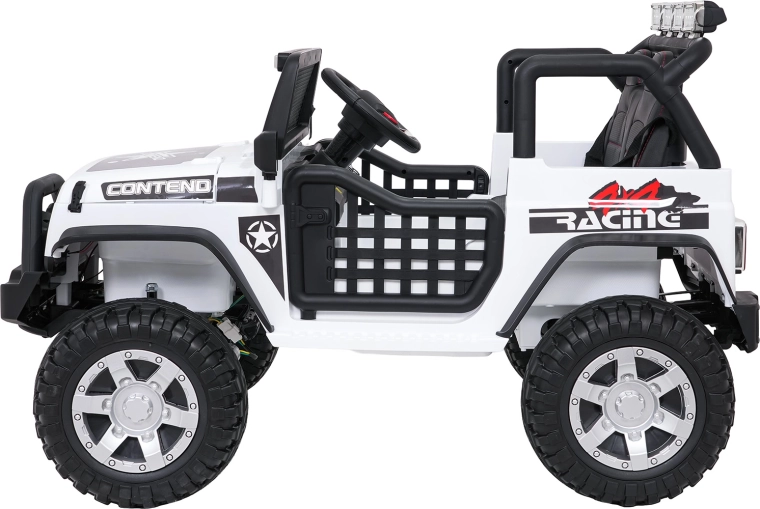 Solidny dziecięcy samochód elektryczny w stylu terenowego jeepa oferuje dwa siedzenia, napęd 4x4 (4×45 W), podwójny akumulator 12 V (2×7 Ah) oraz miękkie koła EVA dla komfortowej jazdy w terenie. Rodzice docenią zdalne sterowanie 2,4 GHz z funkcją STOP, a dzieci oświetlenie LED i panel multimedialny z Bluetooth, USB, MP3 i radiem FM.