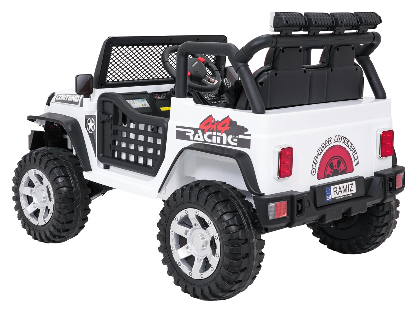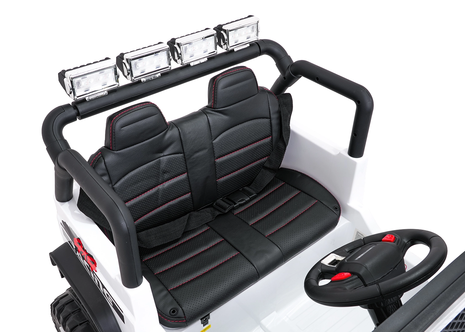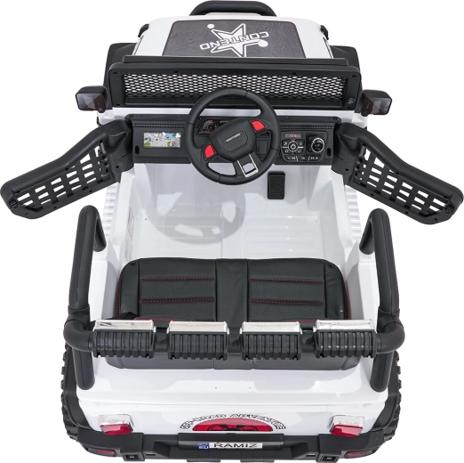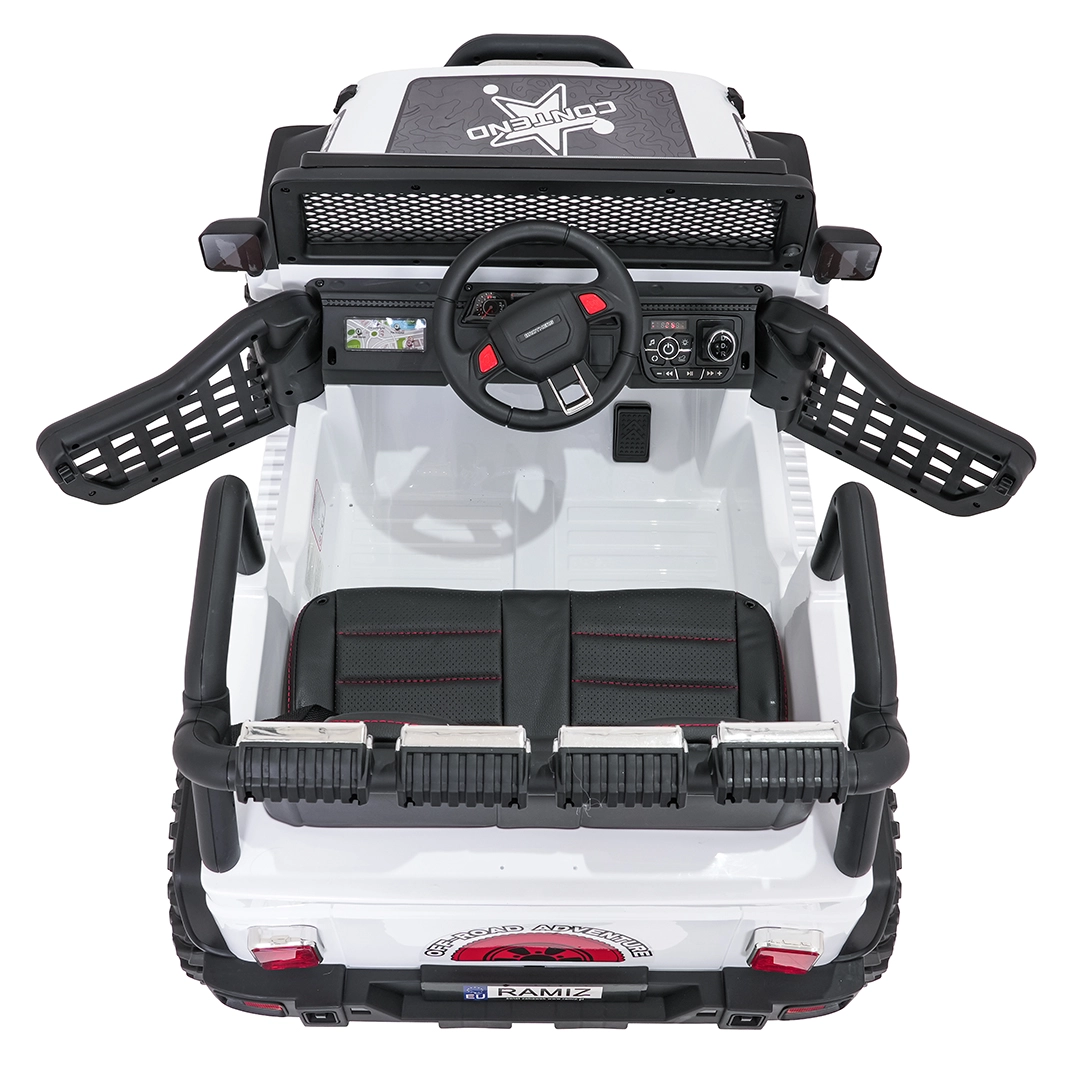 Pilot 2,4 GHz oferuje 3 prędkości i awaryjny przycisk STOP. Dziecko jest bezpieczne dzięki pasom i otwieranym drzwiom.