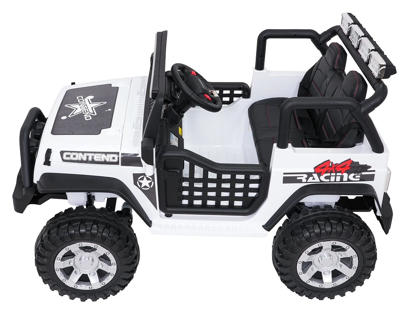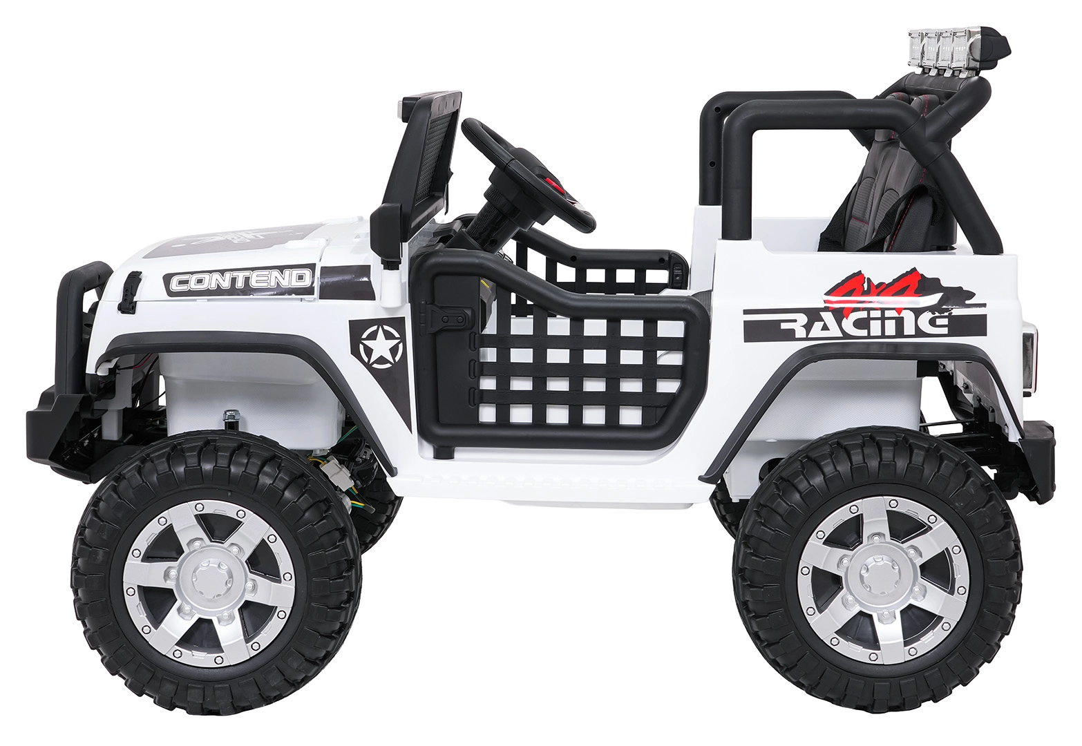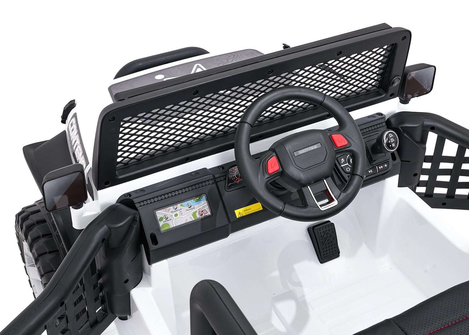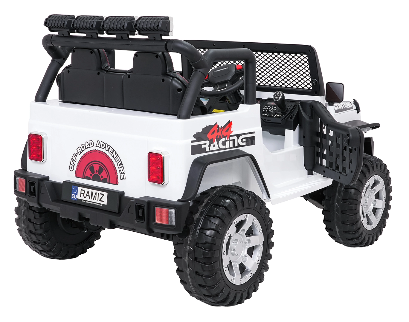 Pilot 2,4 GHz oferuje 3 prędkości i awaryjny przycisk STOP. Dziecko jest bezpieczne dzięki pasom i otwieranym drzwiom.