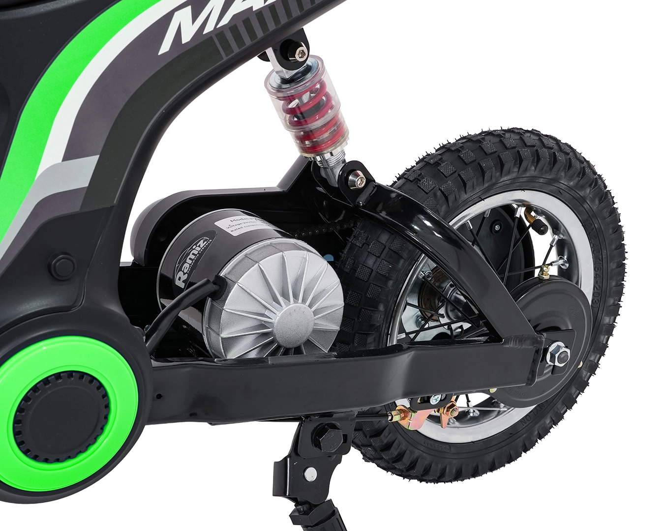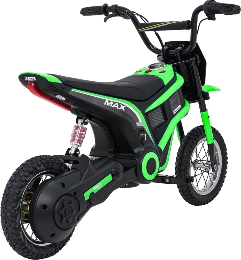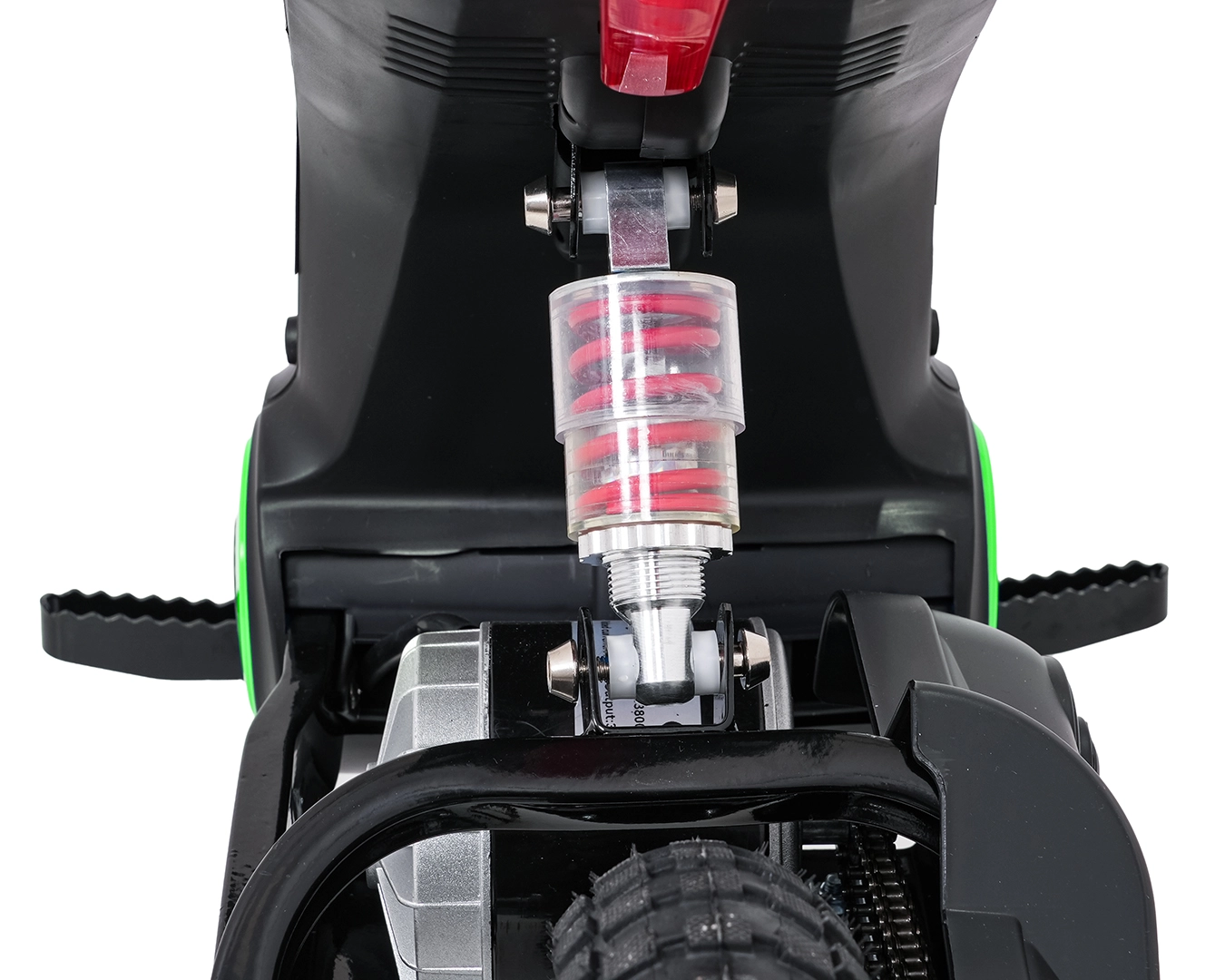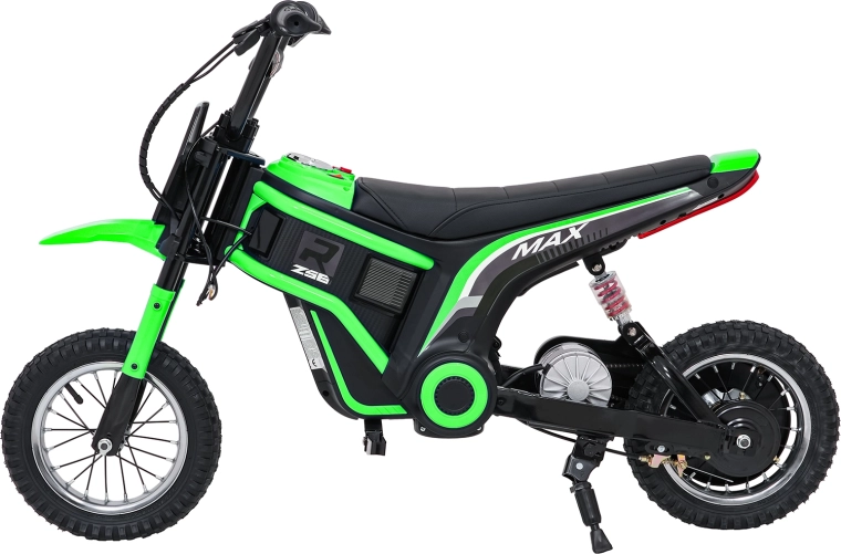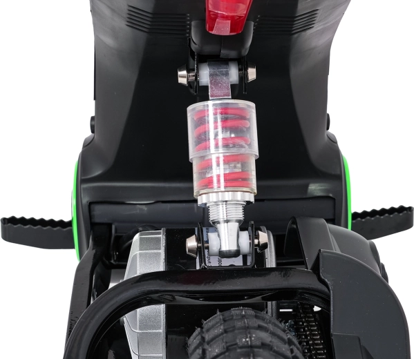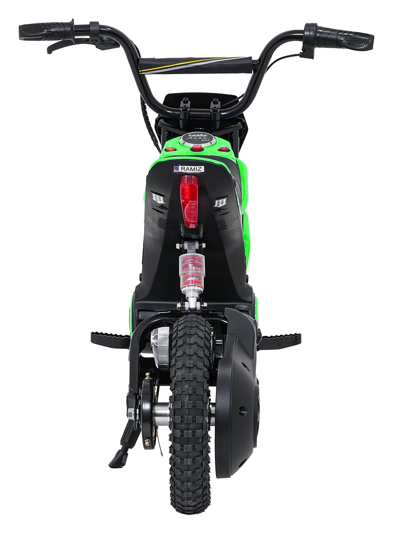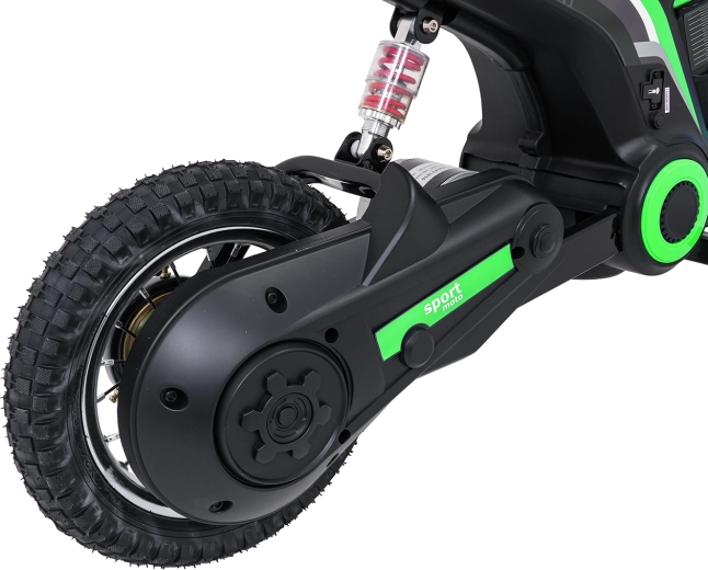 Dziecięcy elektryczny motocykl crossowy RZ56 Max w zielonym kolorze to idealny wybór dla młodych kierowców, którzy chcą doświadczyć prawdziwego off-roadu. Dzięki wydajnemu silnikowi 350W z napędem łańcuchowym i systemowi akumulatorów 24V oferuje żwawy start, płynne ruszanie i stabilną moc. Tylni amortyzator oraz pompowane koła 30×5 cm zapewniają komfort i pewność na różnych nawierzchniach.