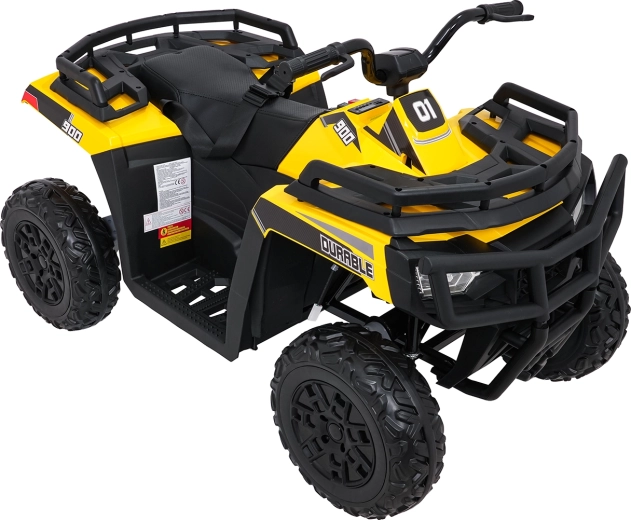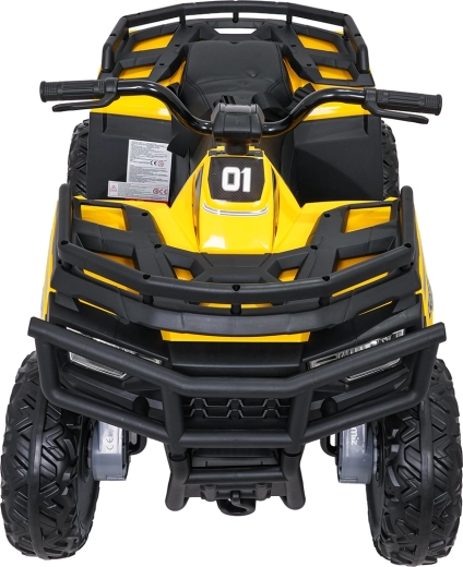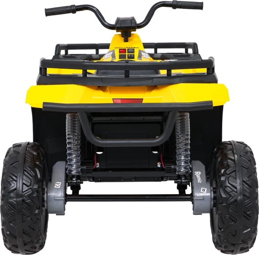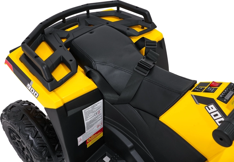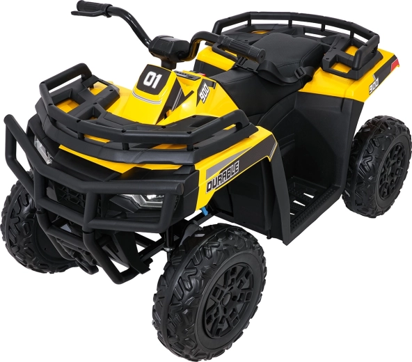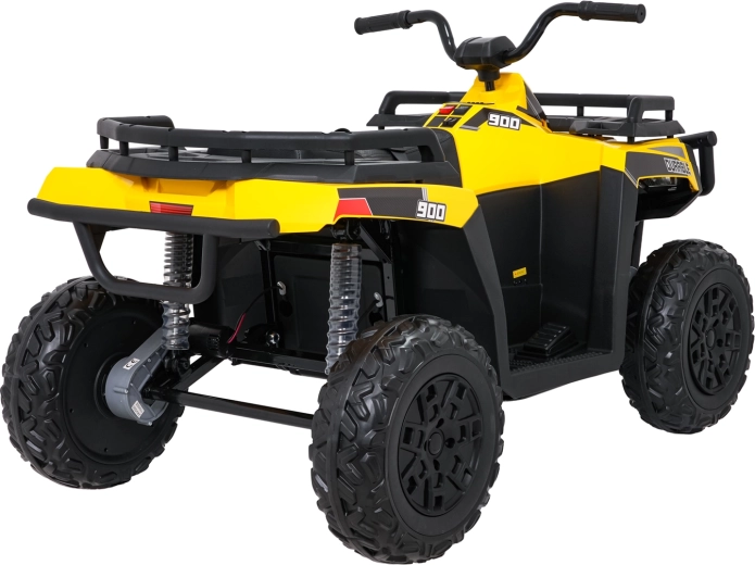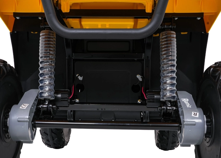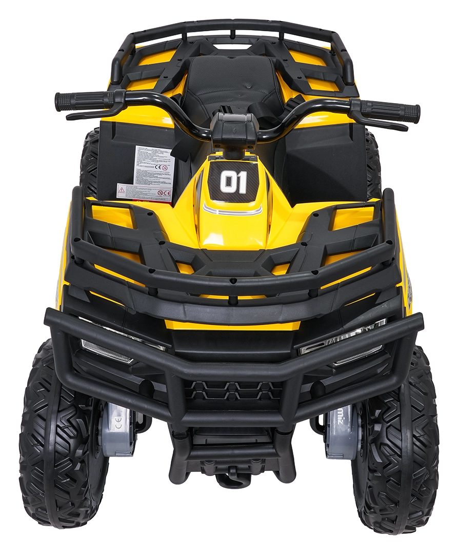 Żółty dziecięcy elektryczny quad WOLF 4x4 oferuje prawdziwe terenowe wrażenia dzięki czterem niezależnym silnikom 200 W, które gwarantują trakcję w terenie i pewność na nierównościach. Duże koła EVA z głębokim bieżnikiem zapewniają znakomitą przyczepność i cichą jazdę, a przednie światła LED poprawiają widoczność i nadają realistyczny wygląd.