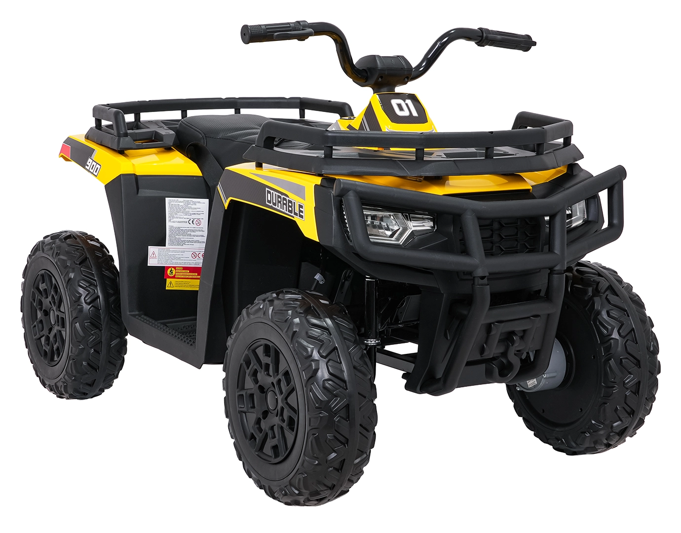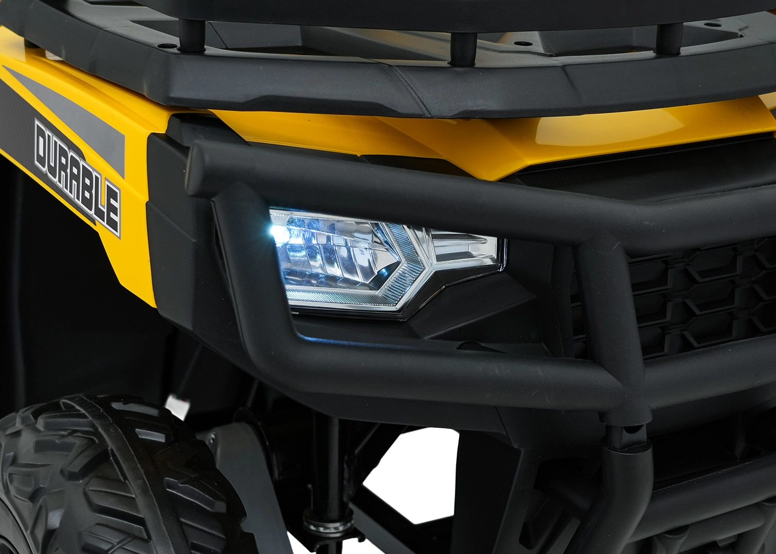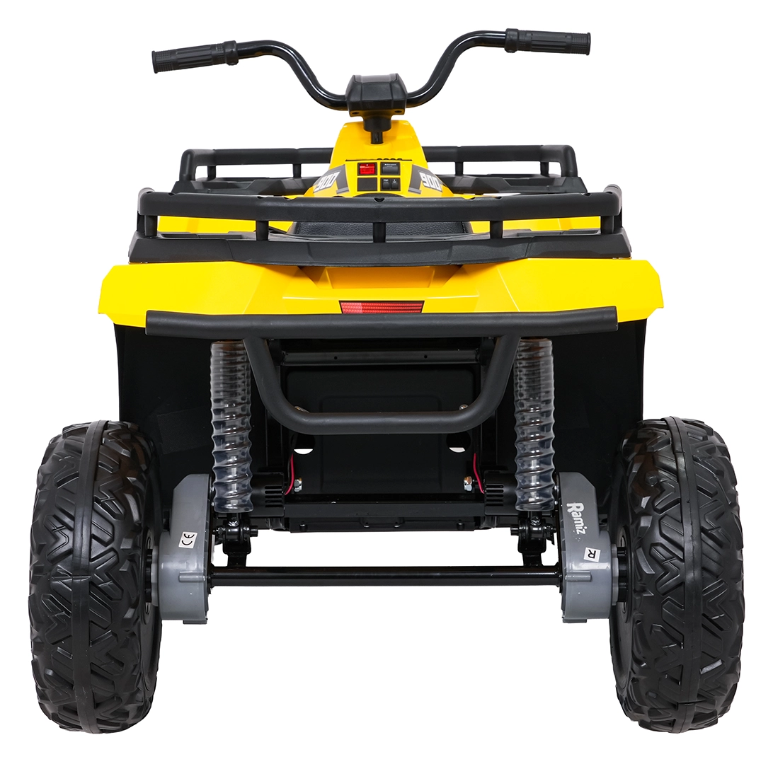 Żółty dziecięcy elektryczny quad WOLF 4x4 oferuje prawdziwe terenowe wrażenia dzięki czterem niezależnym silnikom 200 W, które gwarantują trakcję w terenie i pewność na nierównościach. Duże koła EVA z głębokim bieżnikiem zapewniają znakomitą przyczepność i cichą jazdę, a przednie światła LED poprawiają widoczność i nadają realistyczny wygląd.