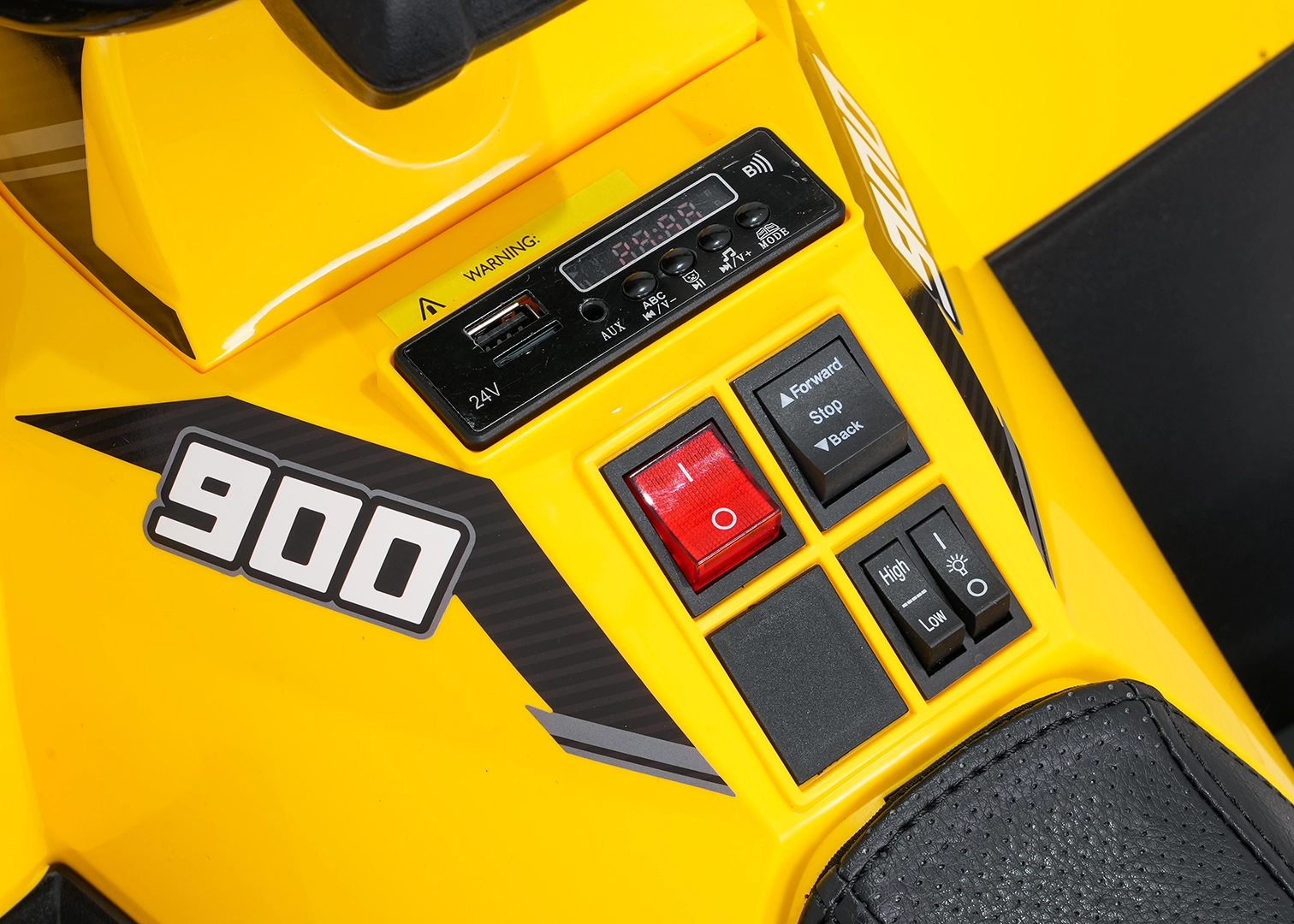 Pilot 2,4 GHz z 3 prędkościami i awaryjnym przyciskiem Stop, pas bezpieczeństwa na siedzeniu oraz światła LED dla lepszej widoczności.