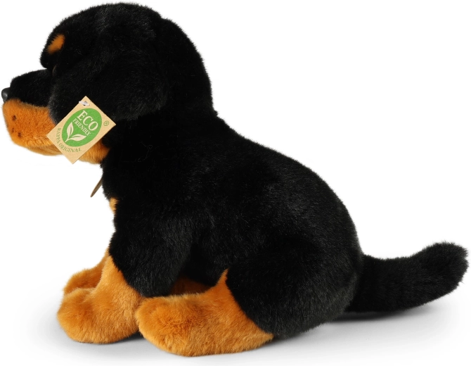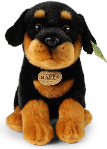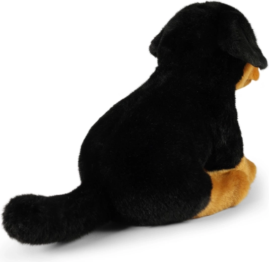 Ten siedzący pluszowy pies rasy rottweiler zachwyca wiernymi detalami, mięciutkim futerkiem i starannym ręcznym wykonaniem, dzięki czemu wygląda jak żywy. Idealny jako przytulny towarzysz do łóżeczka, do pokoju dziecięcego oraz jako urocza dekoracja.