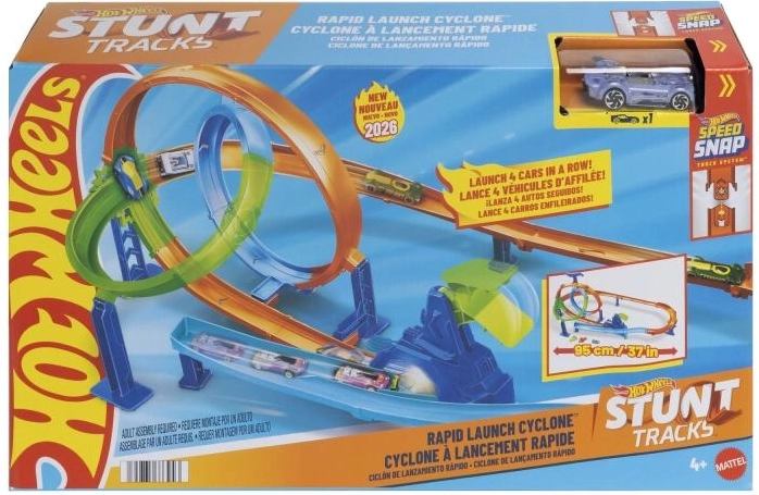 Przeżyj adrenalinową jazdę z torem Hot Wheels Stunt Tracks Rapid Launch Cyclone! Podwójna pętla, wielokrotny wyrzutnik i strefy zderzeń zapewniają nieskończoną kaskaderską akcję i widowiskowe kraksy, które dzieciom szybko się nie znudzą.