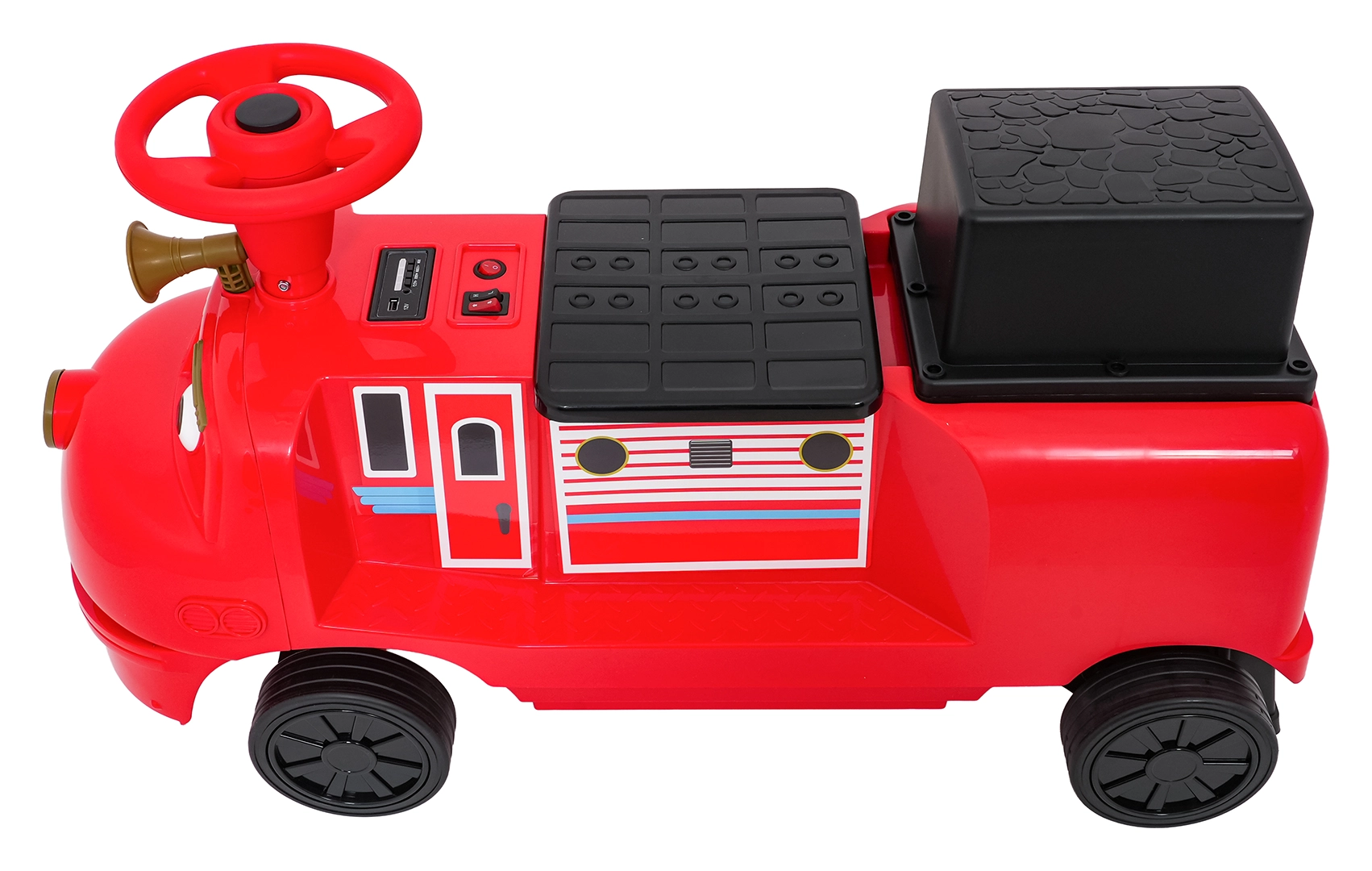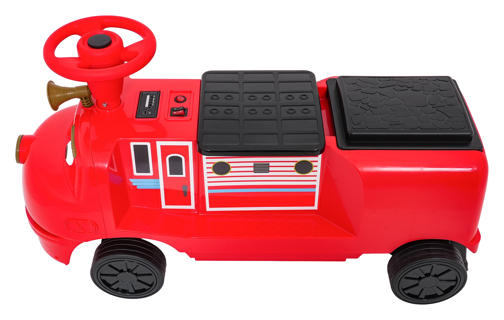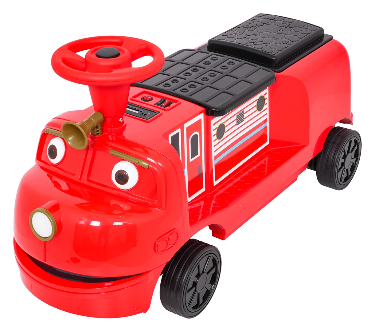 - Bluetooth, MP3, AUX, USB, wgrane melodie, przycisk dźwięku i klaksonu
