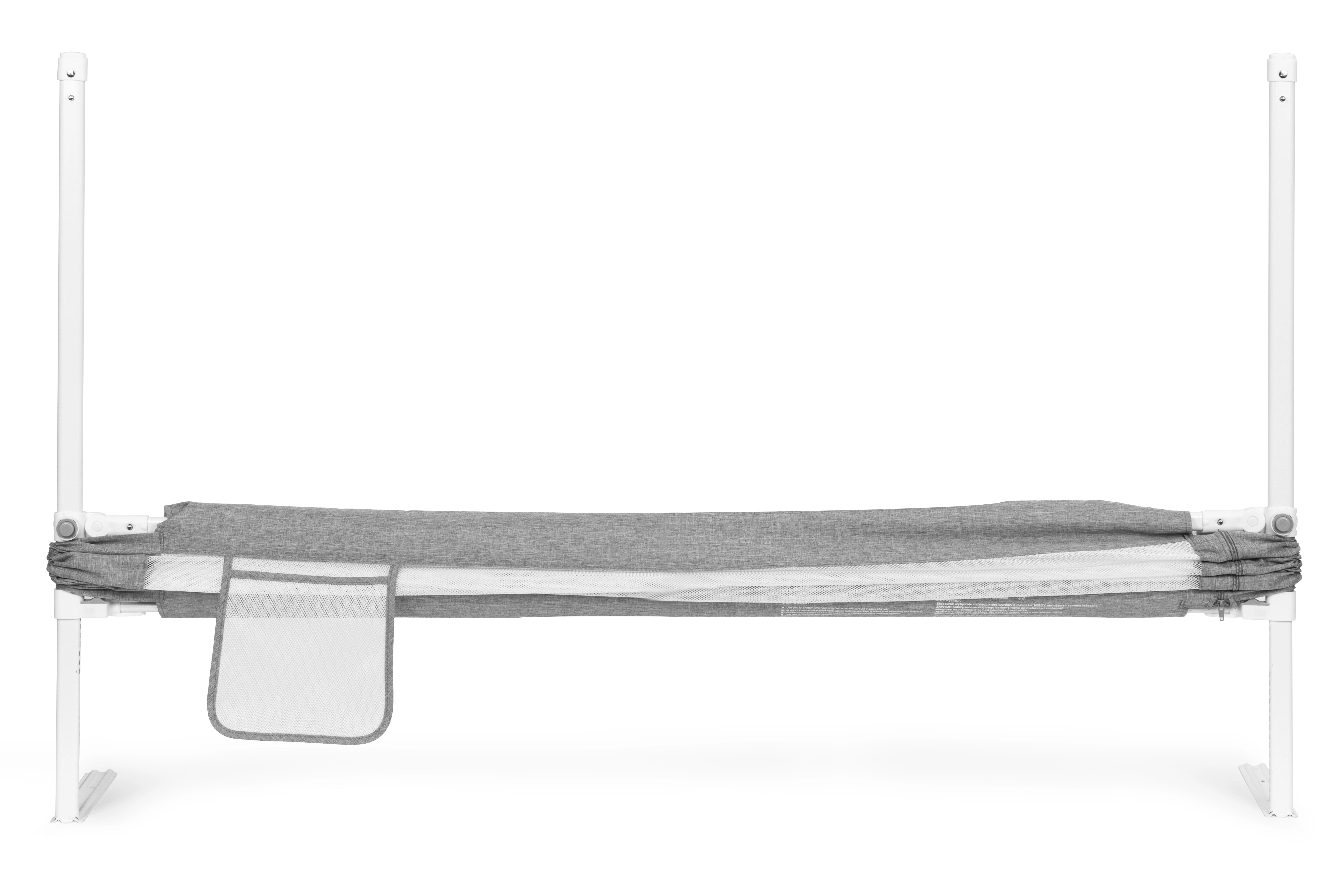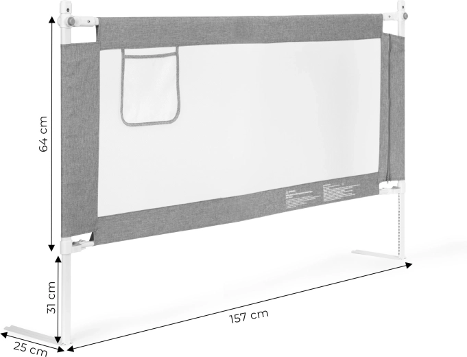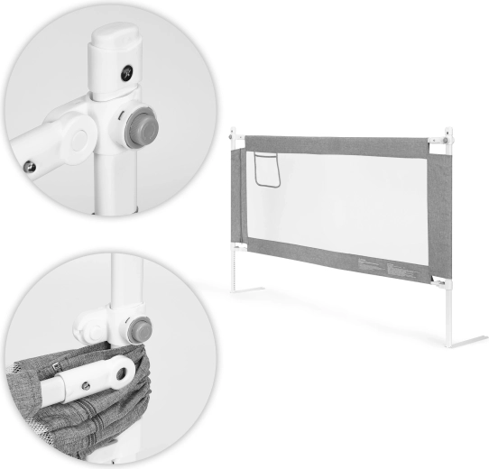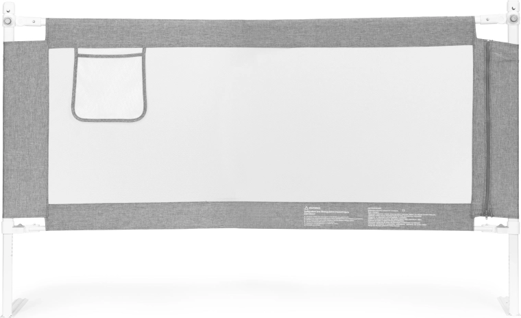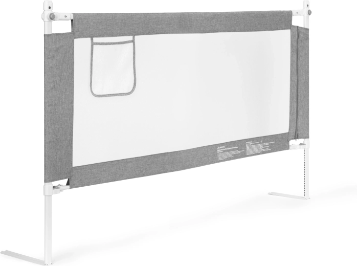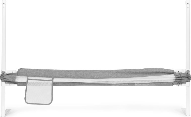 Górną część barierki można łatwo złożyć przyciskiem, dzięki czemu wejście do łóżka i dostęp do dziecka są szybkie i wygodne. Zintegrowana kieszeń utrzymuje pod ręką smoczek, butelkę lub chusteczki. Barierki można połączyć w ciągły zestaw, aby zabezpieczyć więcej boków łóżka.