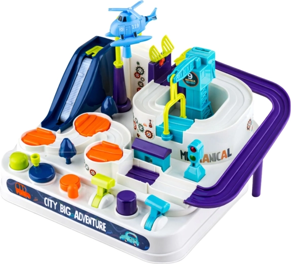 Winda, most, żuraw, obrotnice i kręte drogi tworzą urozmaiconą trasę, która rozwija logikę, koordynację i cierpliwość dzieci.