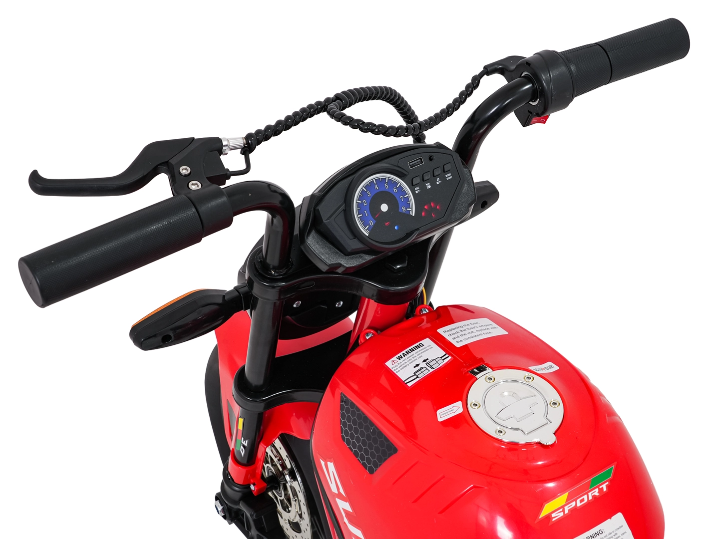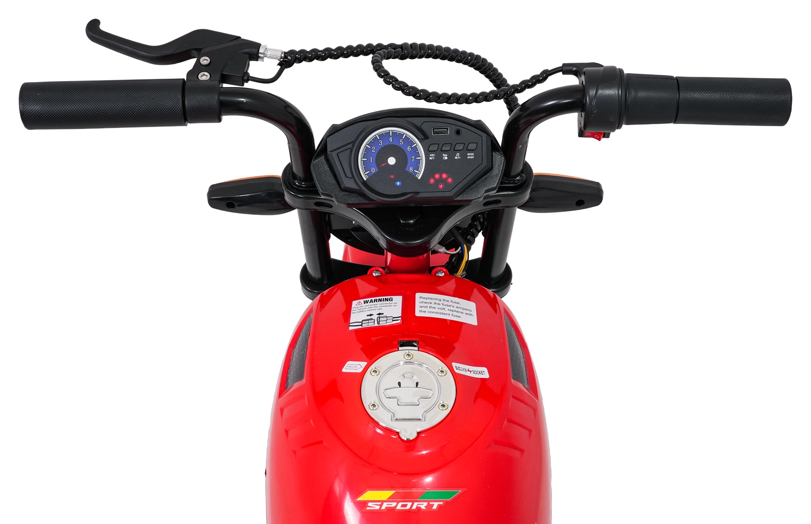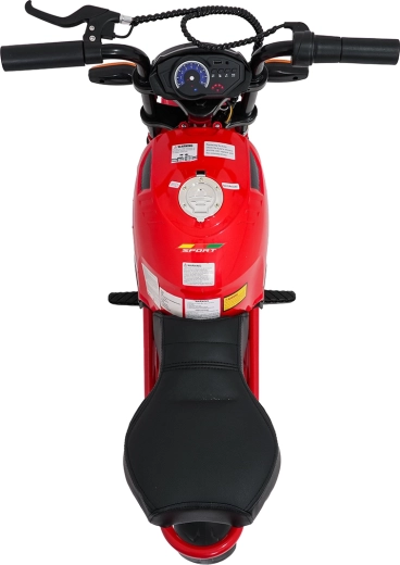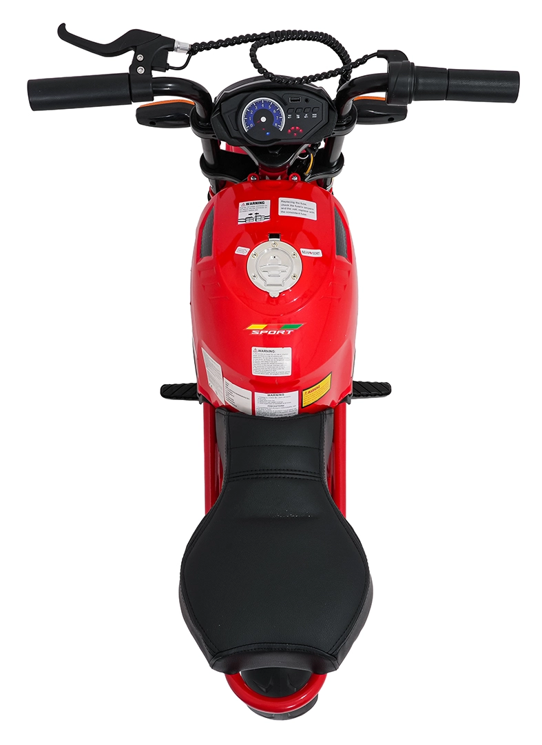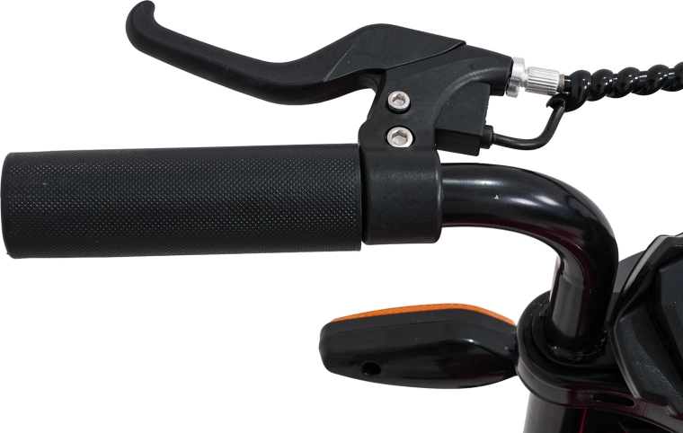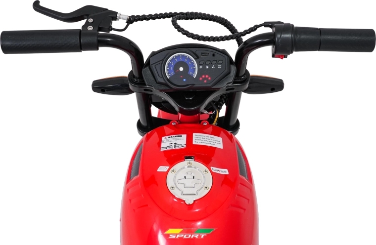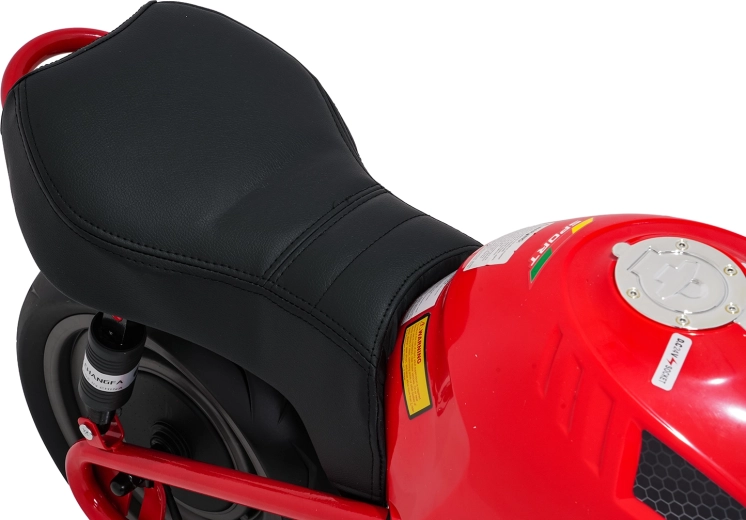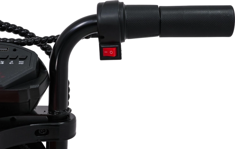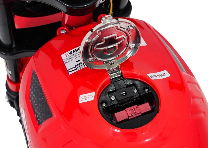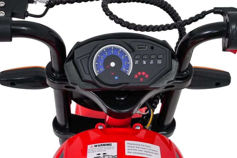 Bezpieczeństwo i styl zapewniają przednie światła LED, kierunkowskazy oraz podświetlana deska rozdzielcza z czytelnymi wskaźnikami. Muzykę i dźwięki obsłuży panel multimedialny z Bluetooth, MP3, AUX, USB, wbudowanymi melodiami oraz klaksonem. Start jest wygodny na przycisk, a siedzisko z czarnej ekoskóry (30×23 cm) dba o komfort.