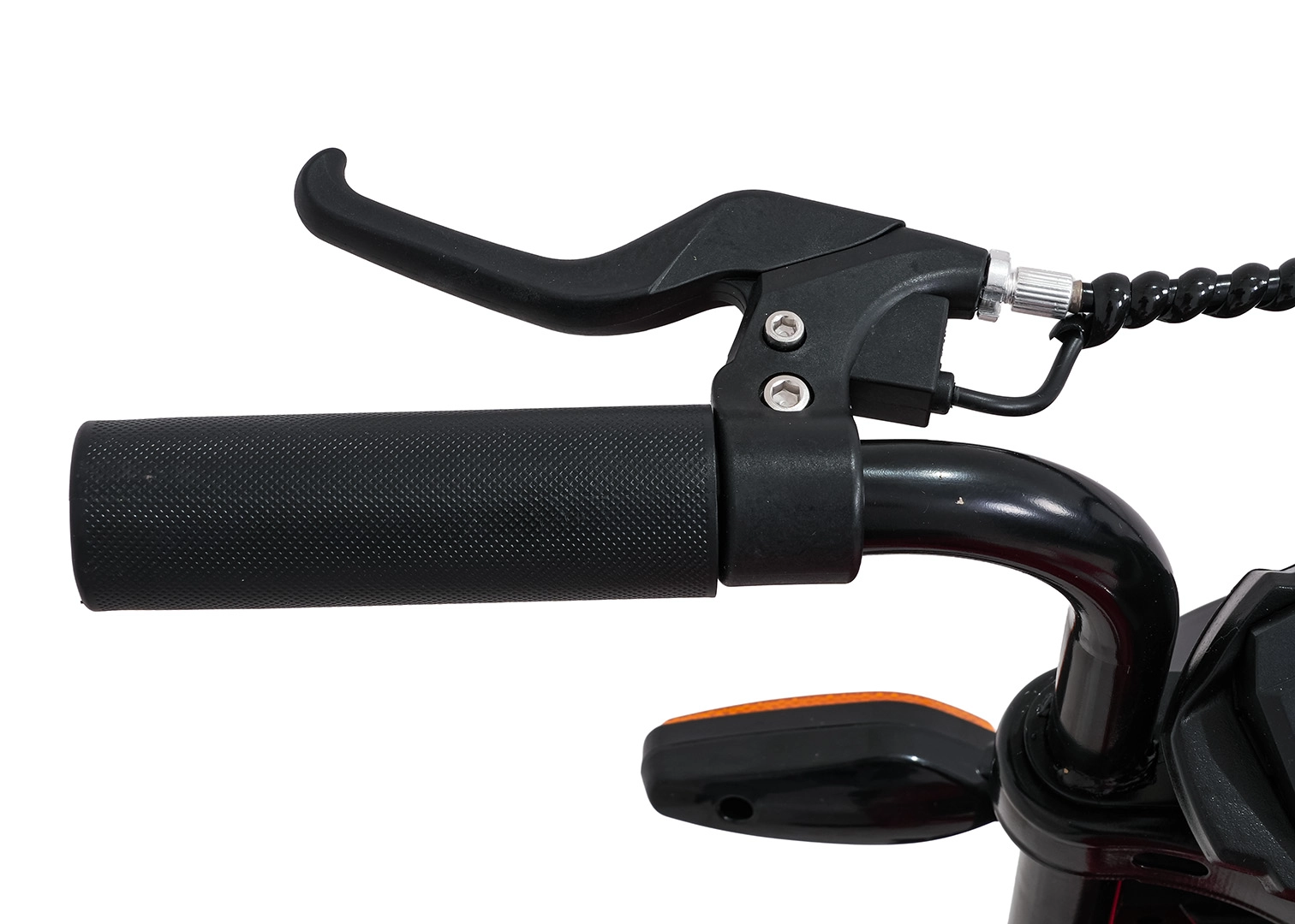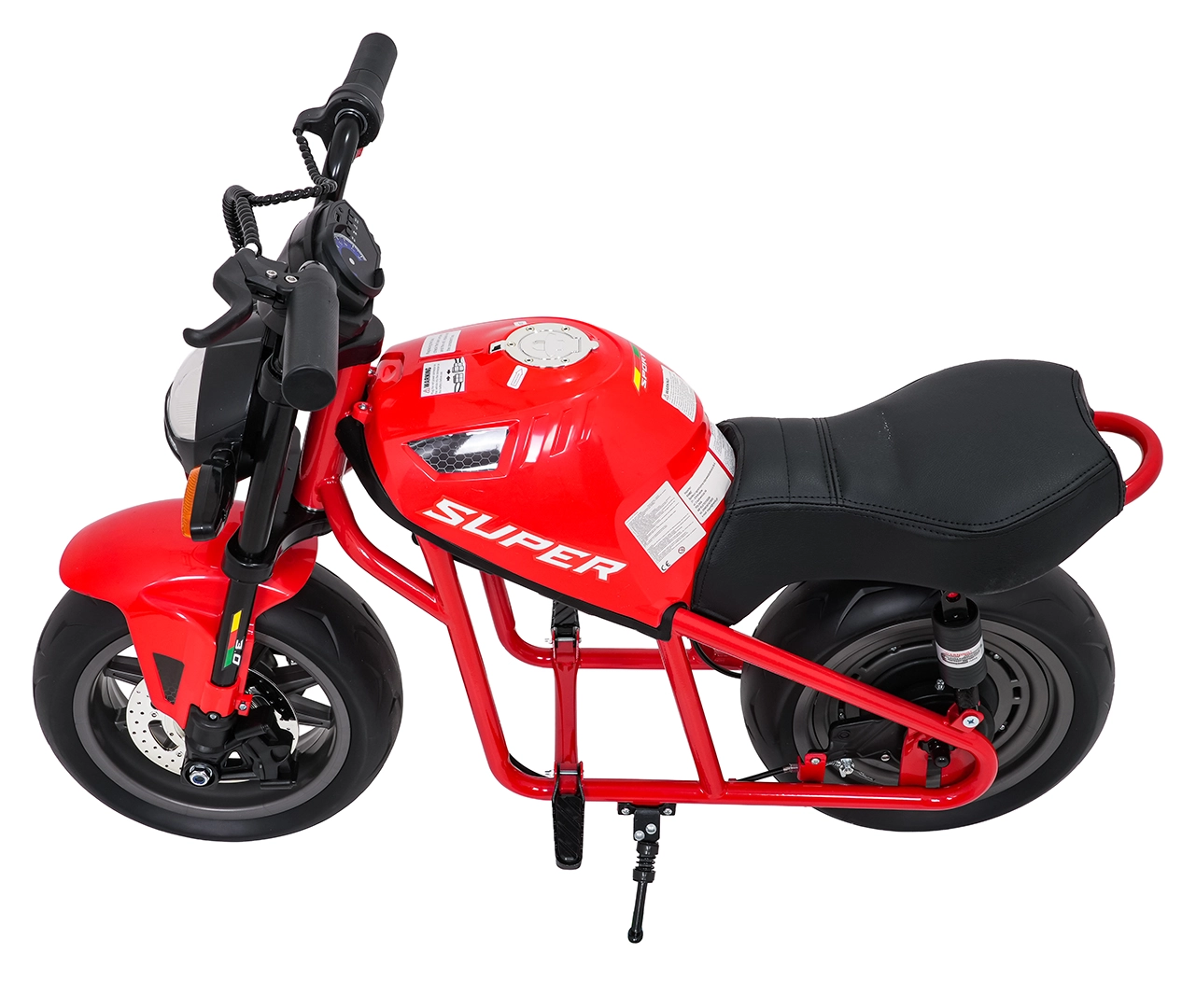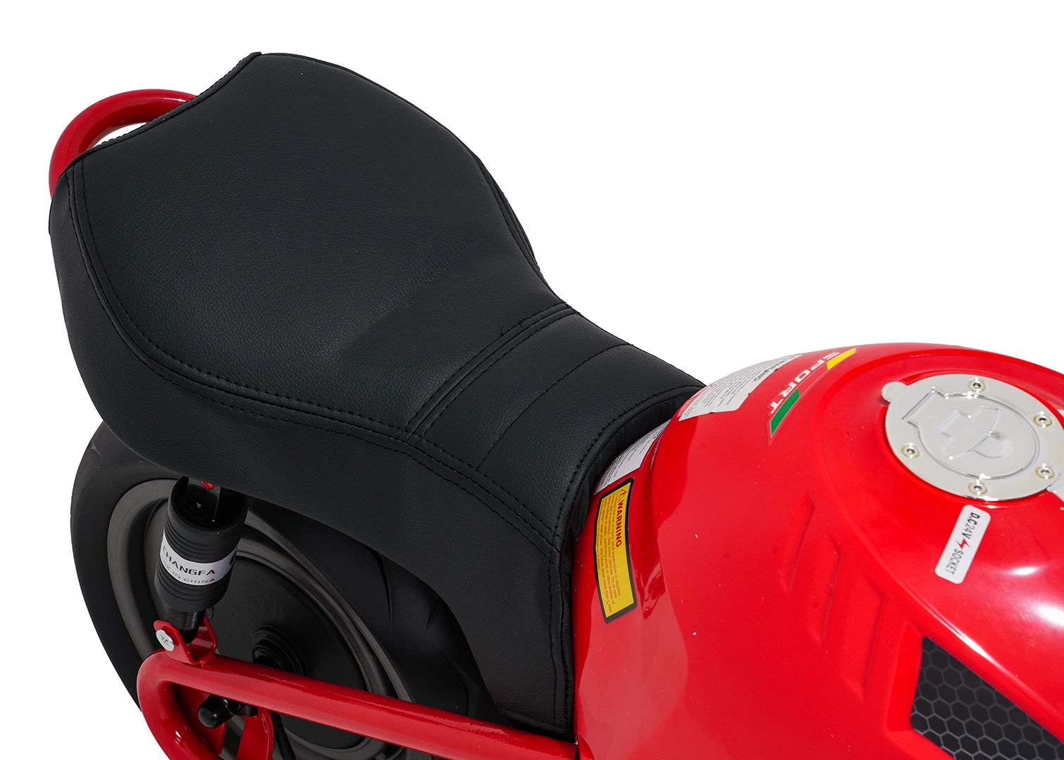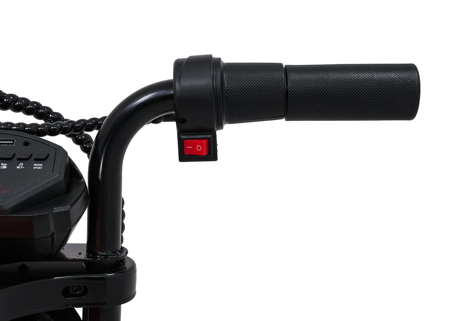 Bezpieczeństwo i styl zapewniają przednie światła LED, kierunkowskazy oraz podświetlana deska rozdzielcza z czytelnymi wskaźnikami. Muzykę i dźwięki obsłuży panel multimedialny z Bluetooth, MP3, AUX, USB, wbudowanymi melodiami oraz klaksonem. Start jest wygodny na przycisk, a siedzisko z czarnej ekoskóry (30×23 cm) dba o komfort.