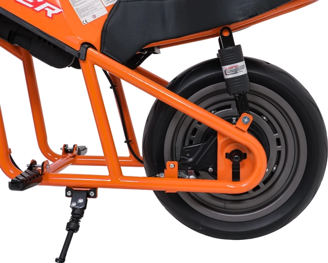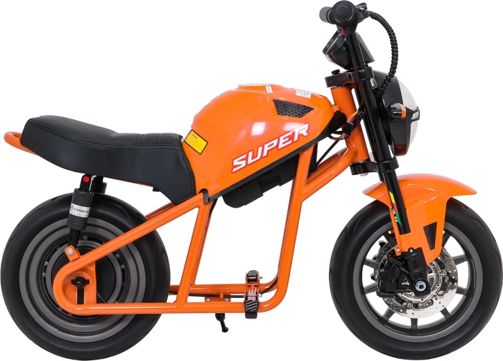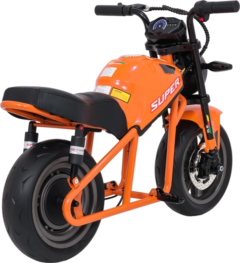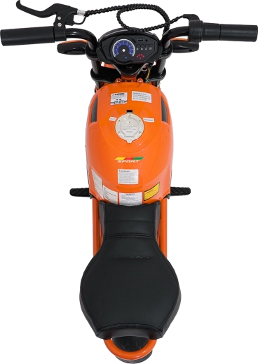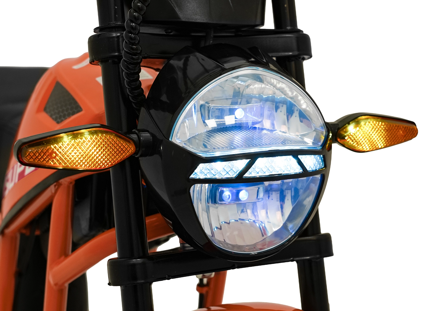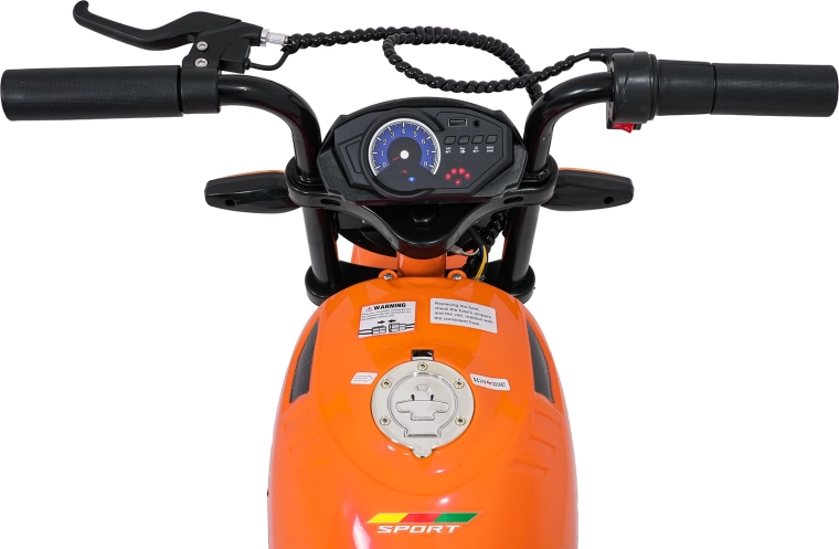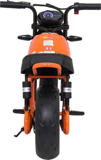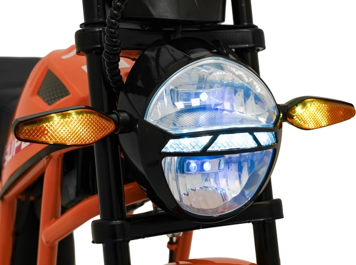 Stylowy dziecięcy motocykl elektryczny SUPERMOTO w kolorze pomarańczowym oferuje mocny silnik 300 W, akumulator 24 V 9 Ah oraz szerokie opony EVA 33 × 12 cm dla stabilnej jazdy. O komfort dbają podwójne tylne amortyzatory z regulacją, bezpieczeństwo zwiększają światła LED i podświetlana deska rozdzielcza. Rozrywkę zapewnia panel audio z Bluetooth, MP3, AUX i USB.