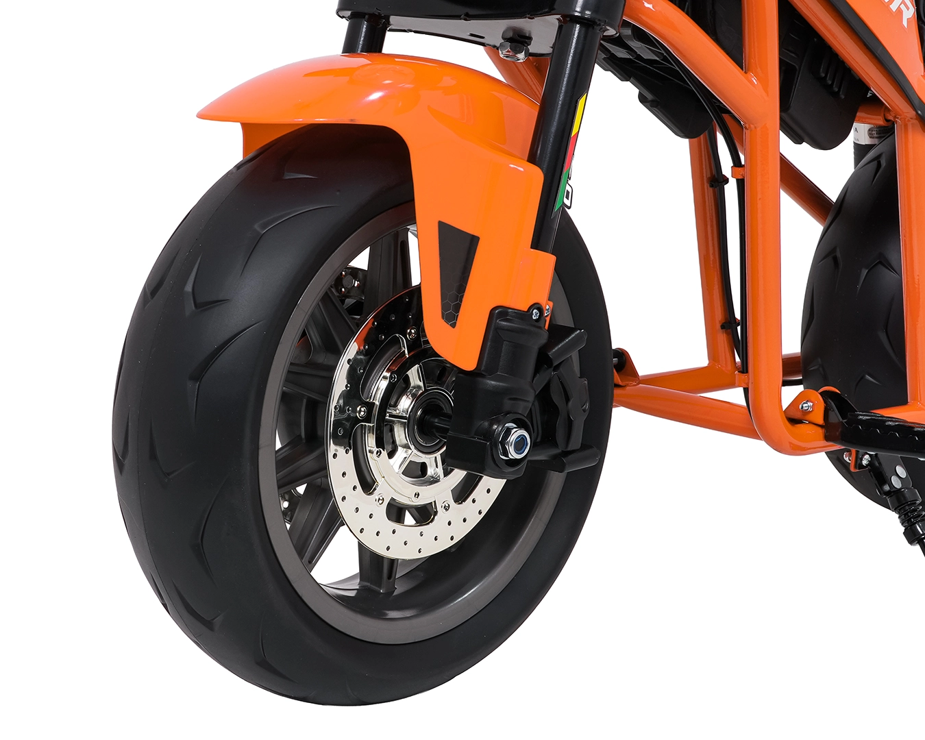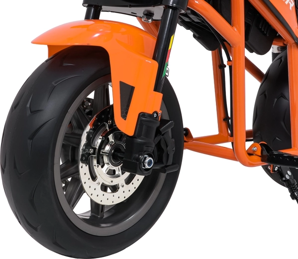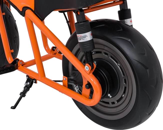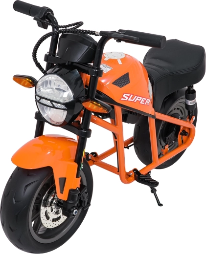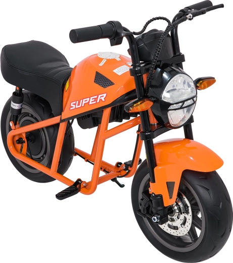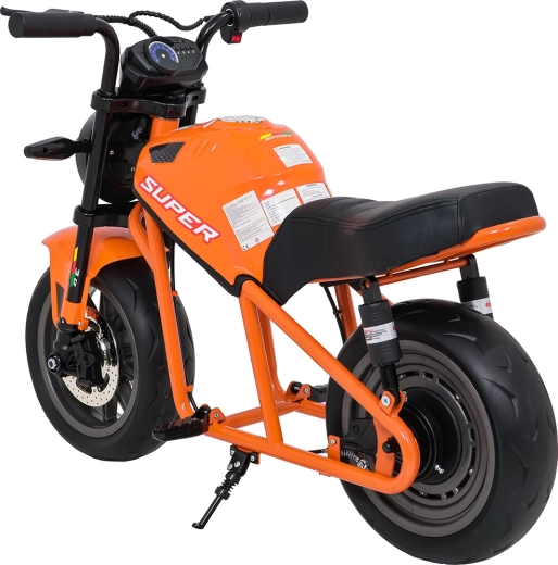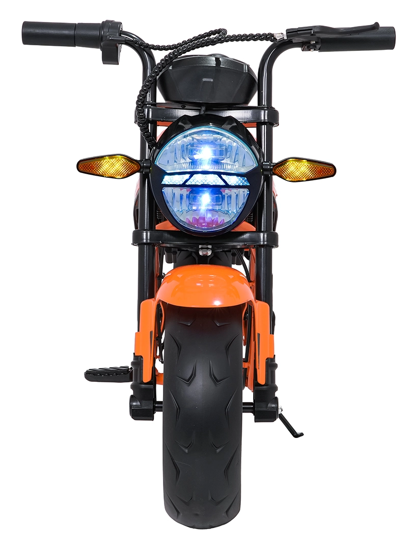 Stylowy dziecięcy motocykl elektryczny SUPERMOTO w kolorze pomarańczowym oferuje mocny silnik 300 W, akumulator 24 V 9 Ah oraz szerokie opony EVA 33 × 12 cm dla stabilnej jazdy. O komfort dbają podwójne tylne amortyzatory z regulacją, bezpieczeństwo zwiększają światła LED i podświetlana deska rozdzielcza. Rozrywkę zapewnia panel audio z Bluetooth, MP3, AUX i USB.