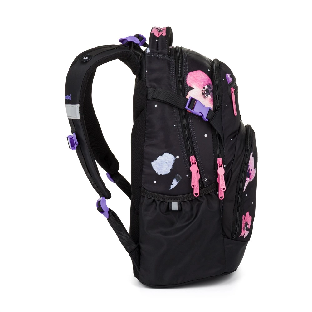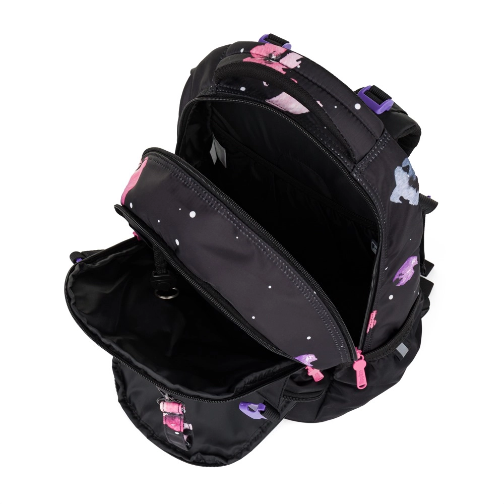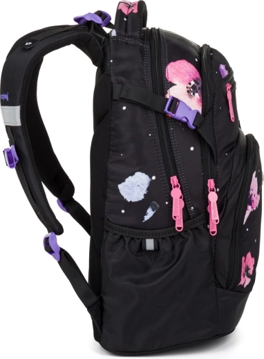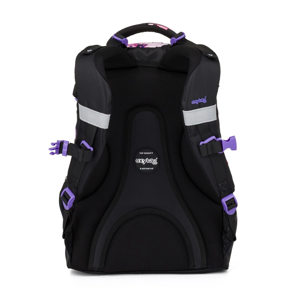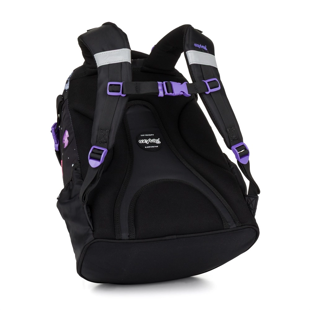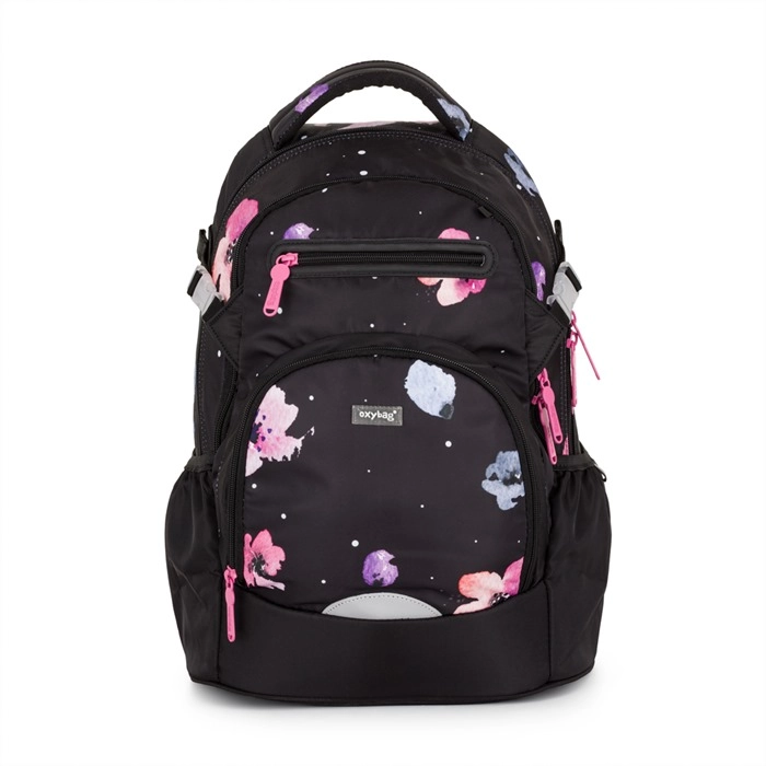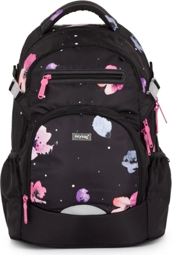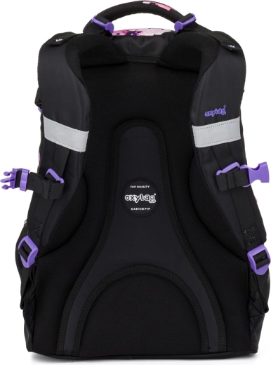 Plecak szkolny OXY Ombre Flowers został zaprojektowany do wygodnego codziennego noszenia od 3. klasy. Dzięki ergonomicznemu panelowi tylnemu (długość 43 cm) i miękko wyściełanym szelkom naramiennym doskonale dopasowuje się do pleców dziecka. Regulowany pasek piersiowy utrzymuje szelki na miejscu, a sztywne, stabilne dno zapobiega przewracaniu i chroni zawartość.