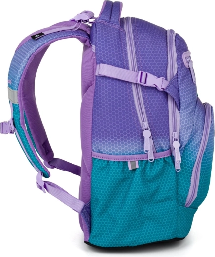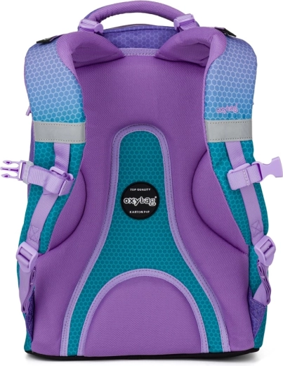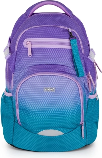 Plecak szkolny OXY Ombre w atrakcyjnej niebiesko‑różowej kolorystyce łączy nowoczesny design z ergonomią dla codziennej wygody. Dzięki anatomicznie profilowanemu panelowi tylnemu i wyściełanym szelkom świetnie leży na plecach, a regulowany pasek piersiowy pomaga równomiernie rozłożyć obciążenie. Usztywnione dno utrzymuje plecak stabilnie i chroni zawartość.