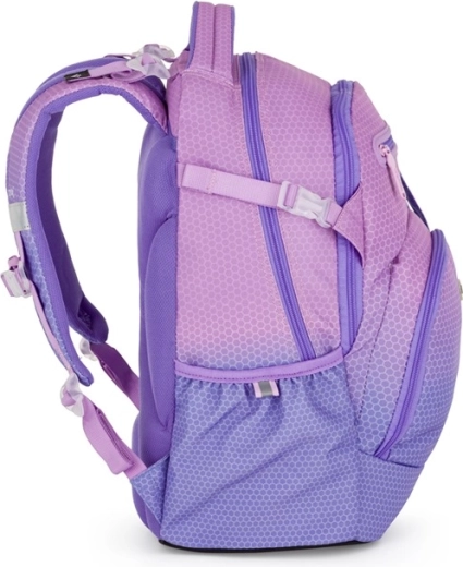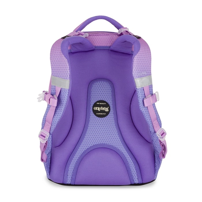 Stylowy plecak szkolny OXY Ombre w różowo‑fioletowej kolorystyce jest idealny dla uczniów od 3. klasy. Oferuje anatomicznie wyprofilowany panel tylni, wyściełane szelki oraz regulowany pasek piersiowy dla wygodnego noszenia. Dzięki usztywnionemu dnu stabilnie stoi, ma dwie pojemne komory, boczne kieszenie na butelkę, przednią kieszeń na przekąskę oraz elementy odblaskowe dla większego bezpieczeństwa.