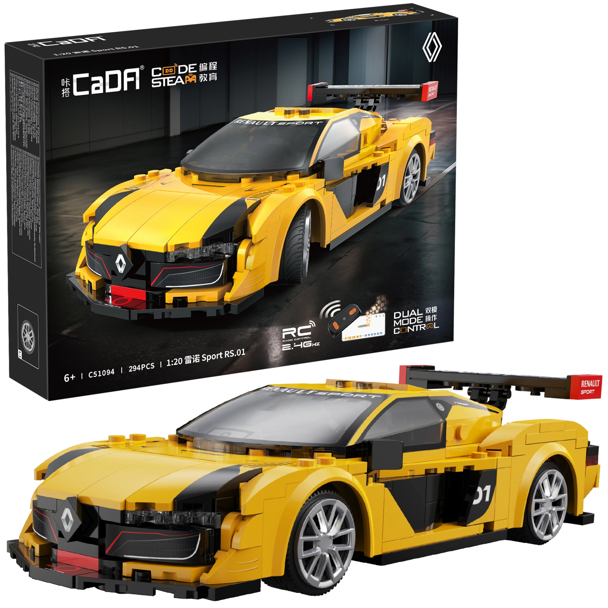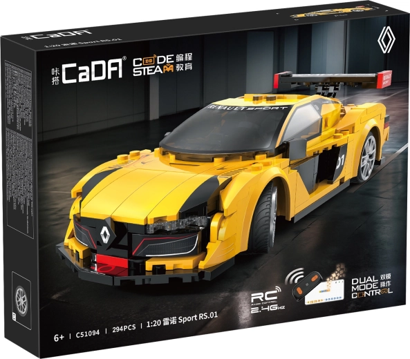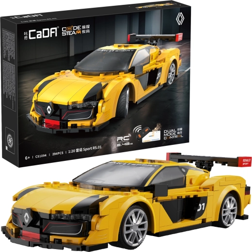 Doświadcz radości z tworzenia i jazdy z zestawem CaDA RENAULT SPORT RS.01. Przemyślana konstrukcja, realistyczne kształty i sportowe żółto‑czarne wykończenie zapewniają świetny wygląd na półce i doskonałą zabawę na podłodze. Dzięki RC Dual Mode możesz sterować autem zarówno kontrolerem 2,4 GHz, jak i przez aplikację Bluetooth z wieloma trybami jazdy.
