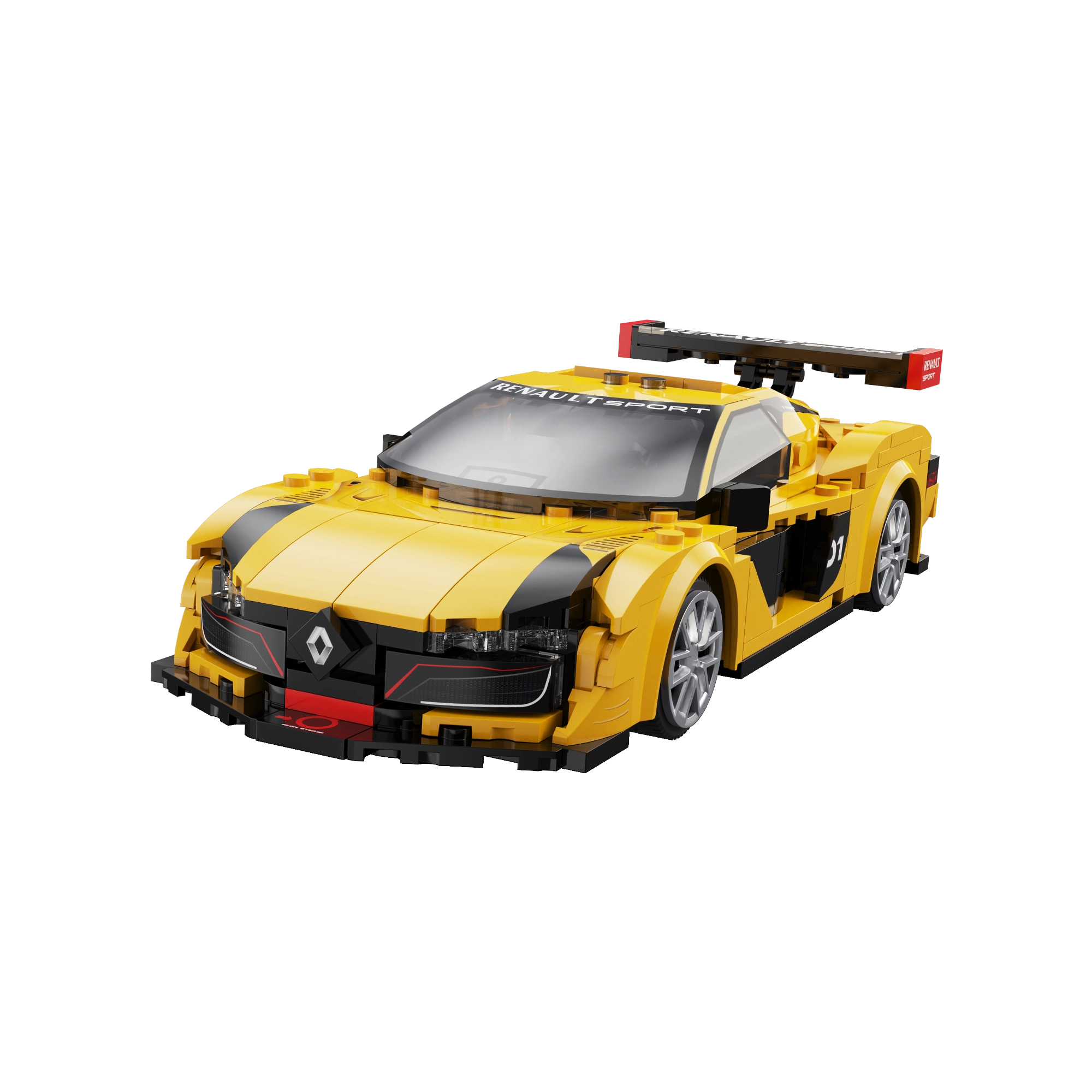 Żółto‑czarna karoseria, masywne tylne skrzydło i niski splitter nadają autentyczny styl RENAULT SPORT – idealny do zabawy i ekspozycji.