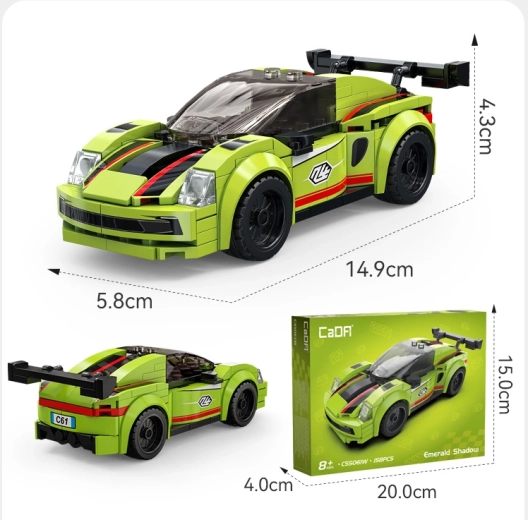Zestaw zawiera 158 elementów, w tym akcesoria oraz przejrzystą instrukcję. Po złożeniu pojazd ma wymiary około 14,9 × 5,8 × 4,3 cm, a dzięki 4 toczącym się kołom gładko porusza się po równych powierzchniach. Zestaw jest kompatybilny z innymi zestawami CaDA, więc łatwo go modyfikować i rozbudowywać.