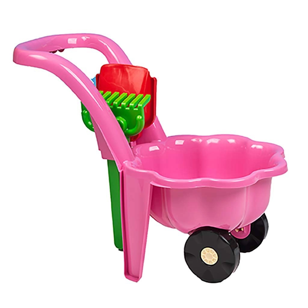 - Kompletne wyposażenie – taczka, łopatka i grabki do realistycznych zabaw ogrodowych.
