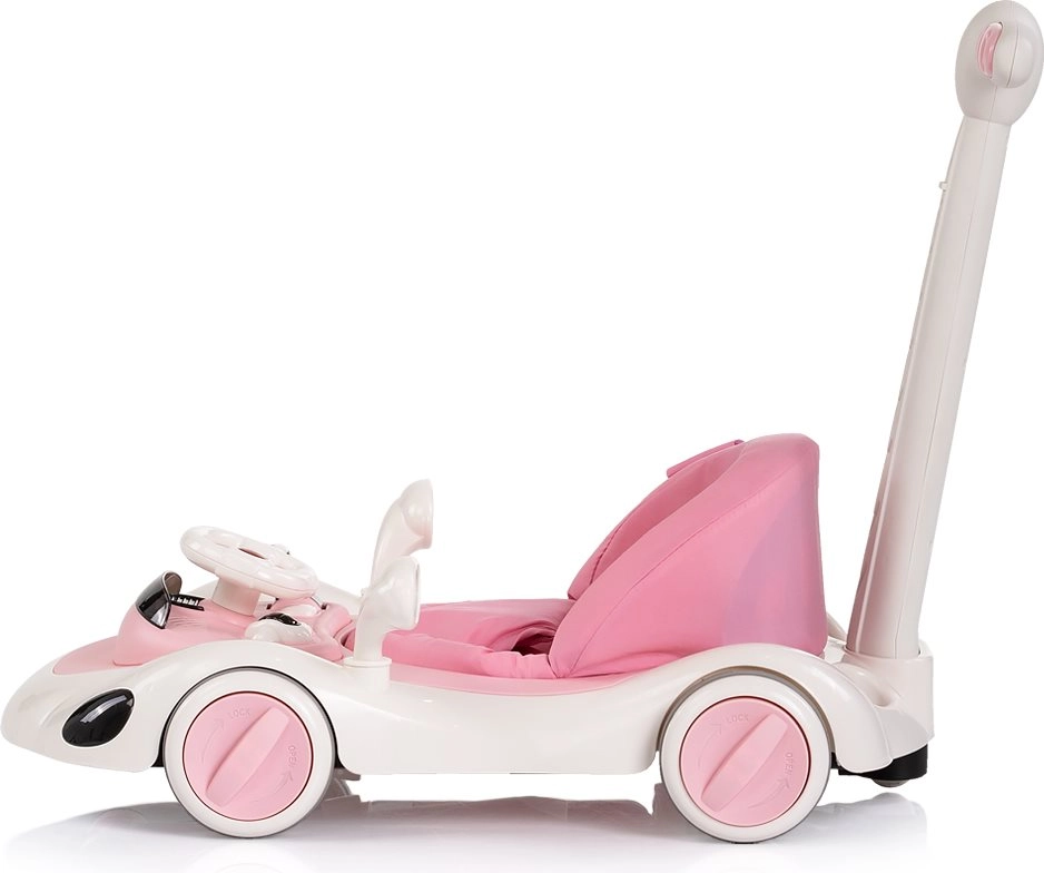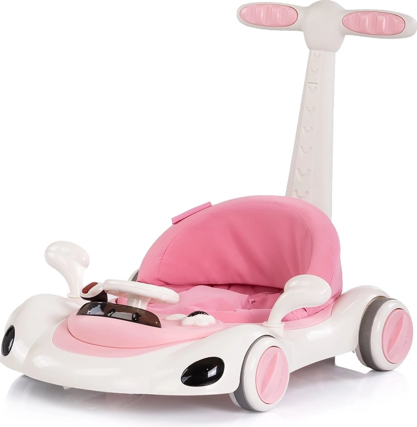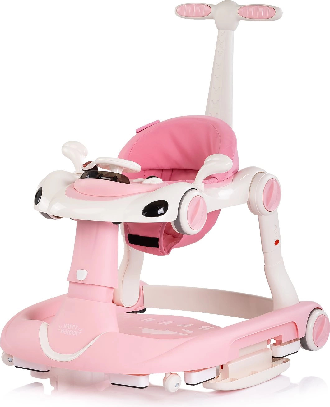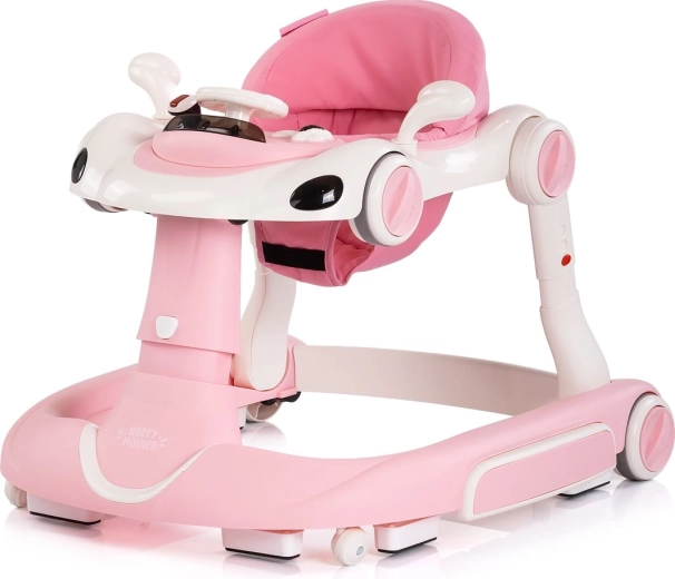 Uniwersalny chodzik 5w1 CHIPOLINO Happy Walker w kolorze różowym wspiera pierwsze kroki i radosne odkrywanie świata. Oferuje stabilną konstrukcję, interaktywny panel z światłami i muzyką, regulowaną wysokość oraz rączkę dla rodzica do bezpiecznego prowadzenia. Dzięki trybowi bujania i skakania, antypoślizgowym podkładkom, hamulcom i blokadzie kółek sprawdza się w codziennym użytkowaniu i wspiera rozwój równowagi, koordynacji oraz motoryki.
