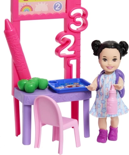 W zestawie znajduje się lalka Barbie w uroczystej sukience, mała lalka ucznia, krzesełko, plecak, tacka, klej, książka, pluszowy miś oraz inne szkolne rekwizyty. Dzięki łatwym do chwytania akcesoriom i odczepianym elementom zabawa jest prosta i wciągająca dla dzieci od 3 lat.
