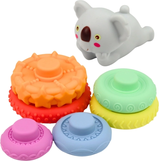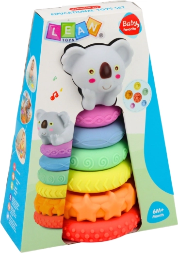 Ta edukacyjna zabawka do układania oferuje 7 elementów, w tym figurkę koali i kolorowe krążki o różnych fakturach. Dzieci ćwiczą układanie od największego do najmniejszego, porównywanie kształtów i kolorów oraz logiczne myślenie. Pastelowe kolory przyciągają uwagę i zachęcają do odkrywania.