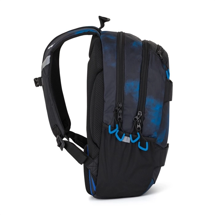 Wnętrze zostało sprytnie zaprojektowane: dwie główne komory mieszczą książki i teczki, wzmocniona kieszeń bezpiecznie ochroni laptop, mniejsza kieszeń i karabińczyk pomagają utrzymać porządek w drobiazgach. Praktyczna ukryta kieszeń na plecach zabezpieczy kosztowności, a boczna kieszeń jest przygotowana na butelkę. Elementy odblaskowe zwiększają widoczność w drodze do i ze szkoły.