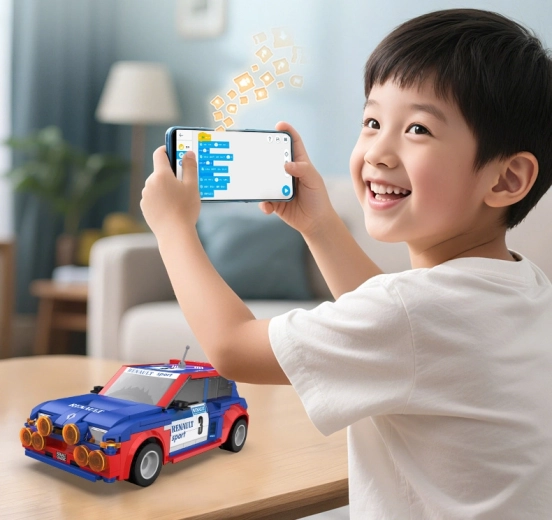 Model RC obsługuje Dual Mode – możesz nim sterować pilotem 2,4 GHz lub przez aplikację mobilną z kilkoma trybami (wirtualny pilot, programowanie Scratch, sterowanie żyroskopowe, rysowanie trasy). Auto osiąga prędkość do 3,8 km/h i utrzymuje stabilne połączenie na dystansie ponad 20 metrów.