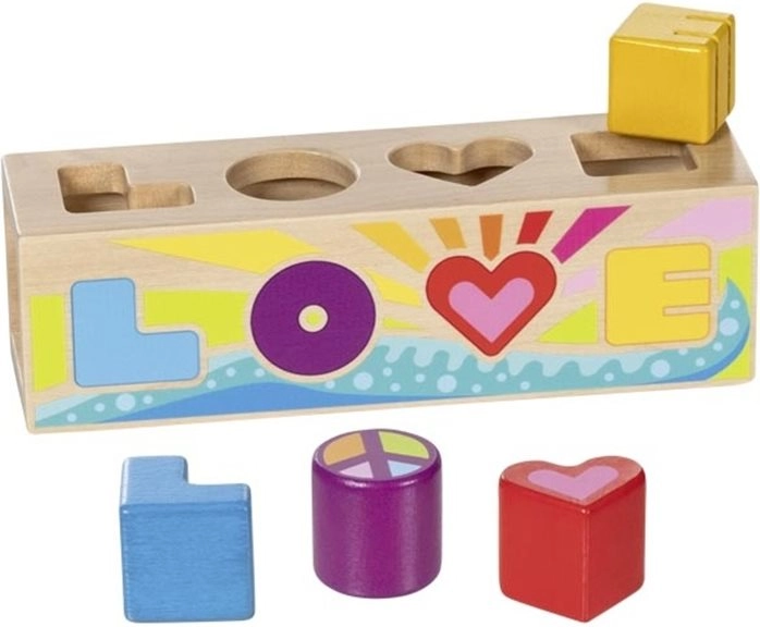 Dzieci łatwo dopasowują elementy do odpowiednich otworów, trenują małą motorykę, logiczne myślenie i poznają litery L, O, V, E.
