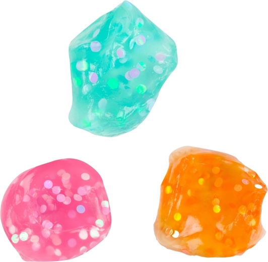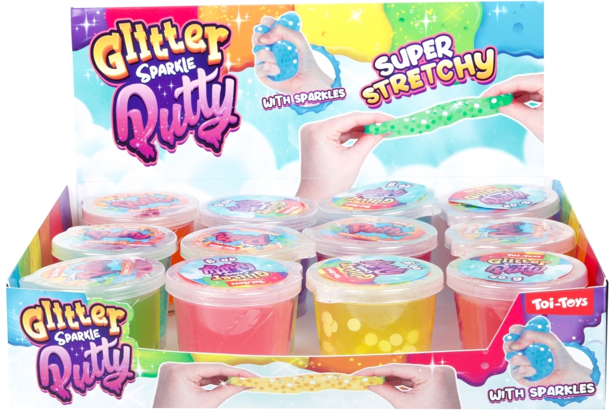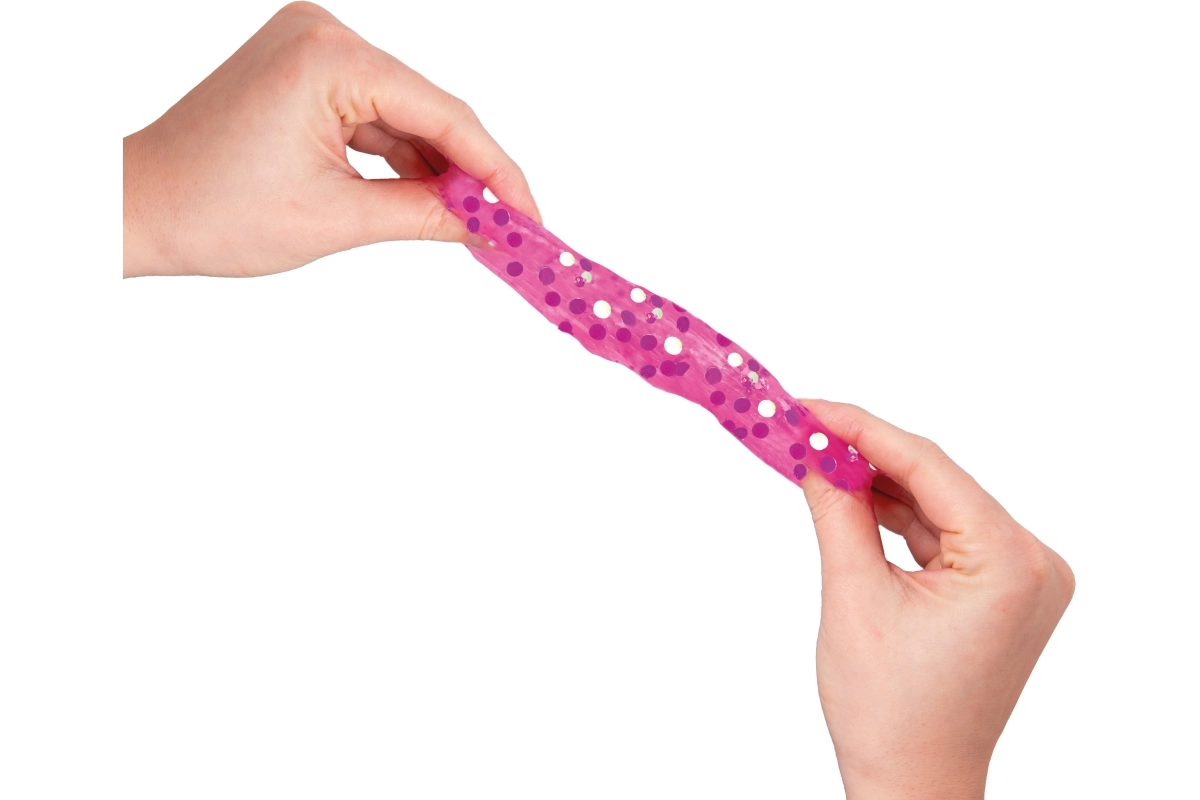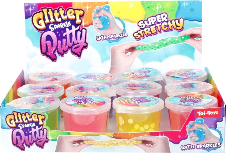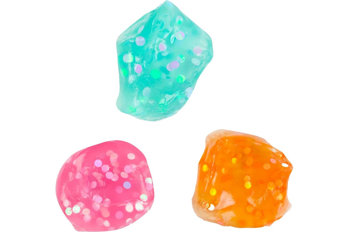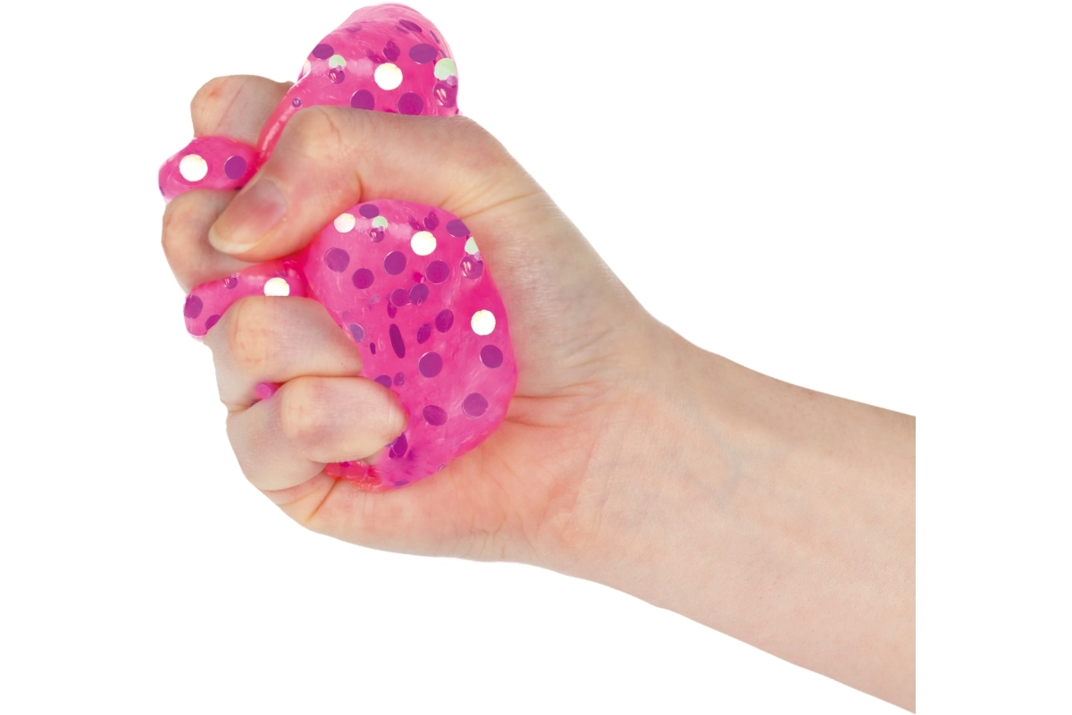 Ten kolorowy glut z dużymi brokatowymi drobinkami zapewnia świetne doznania sensoryczne – jest przyjemnie plastyczny, można go rozciągać, ściskać i formować, a w świetle pięknie się iskrzy. Idealny jako antystresowa pomoc i zabawka dla dzieci od 3 lat.