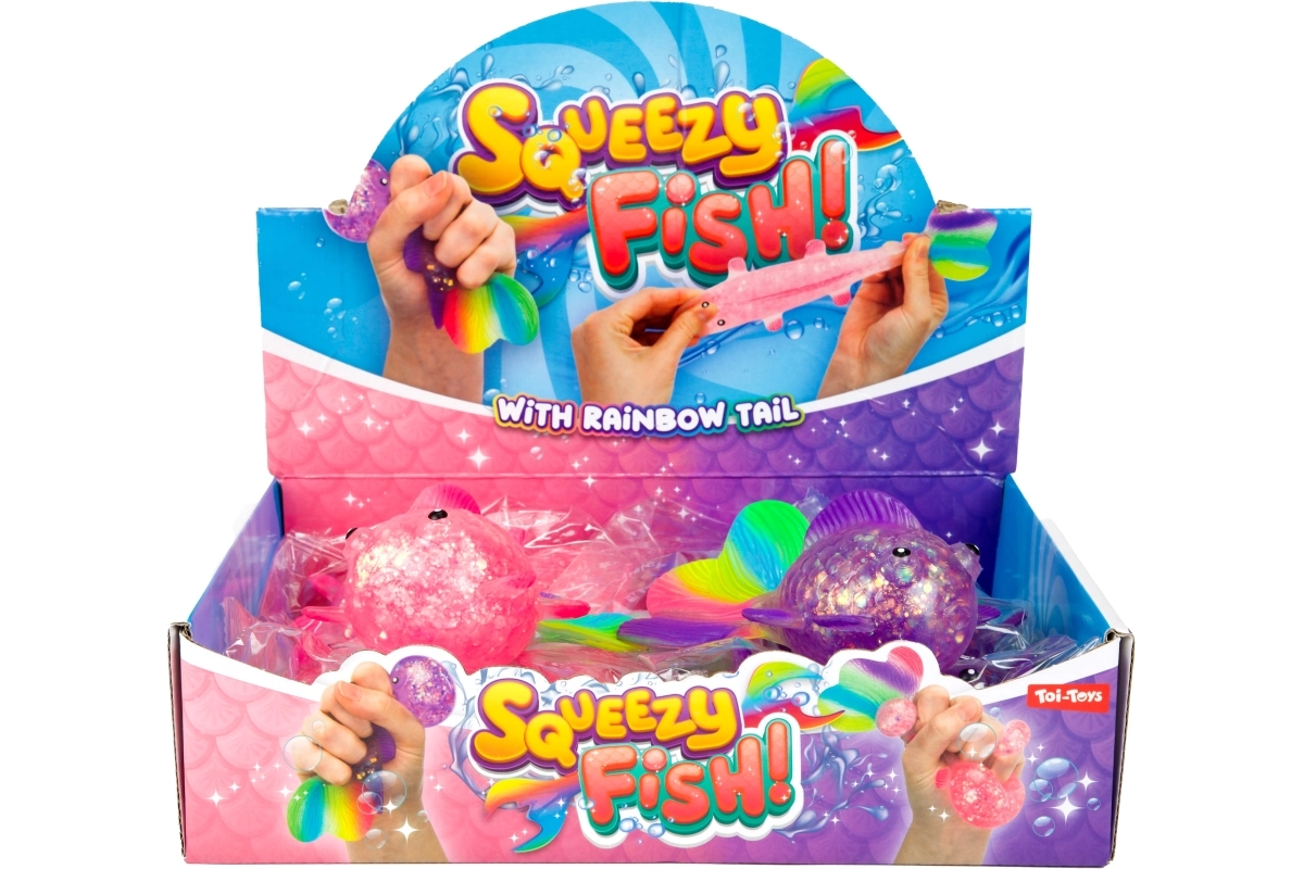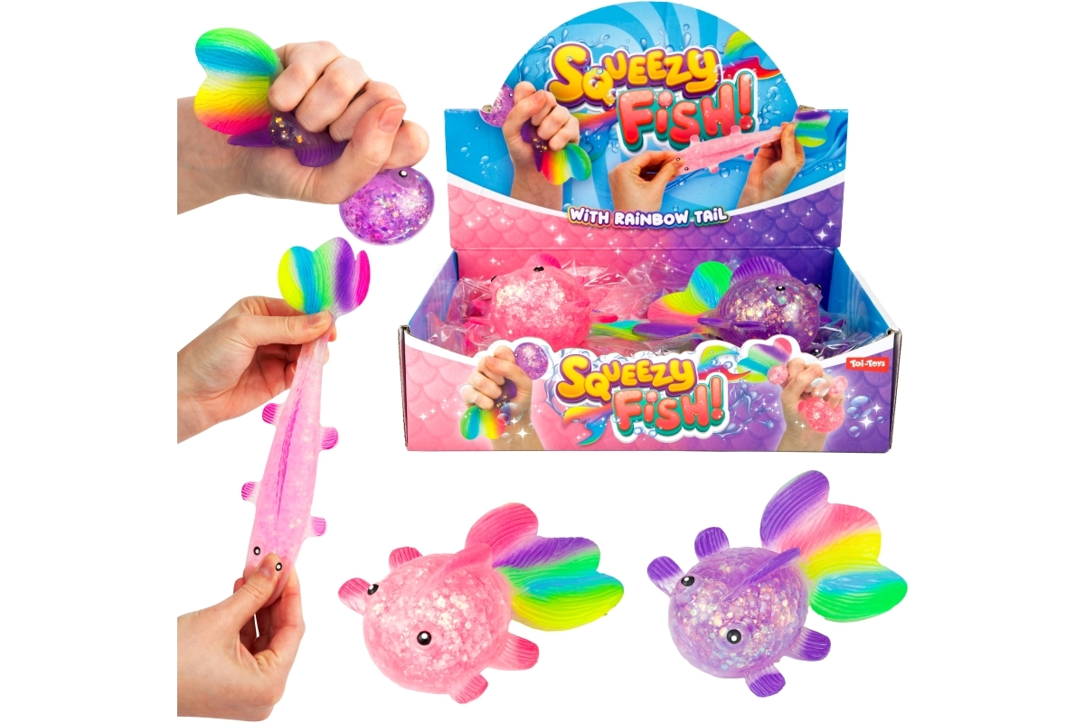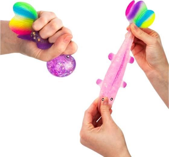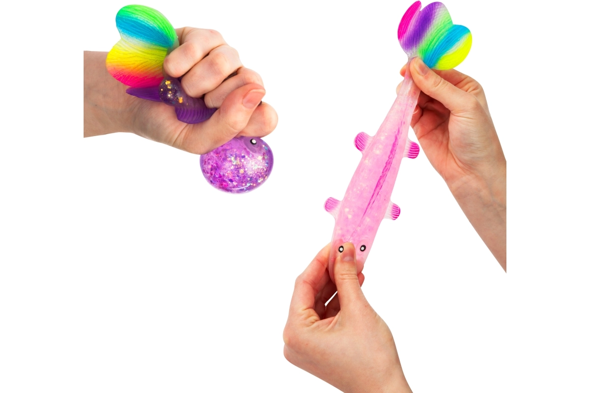 Przezroczyste ciało z brokatem oraz kolorowa płetwa ogonowa przyciągają uwagę dzieci i dorosłych, zachęcając do dalszego ściskania.