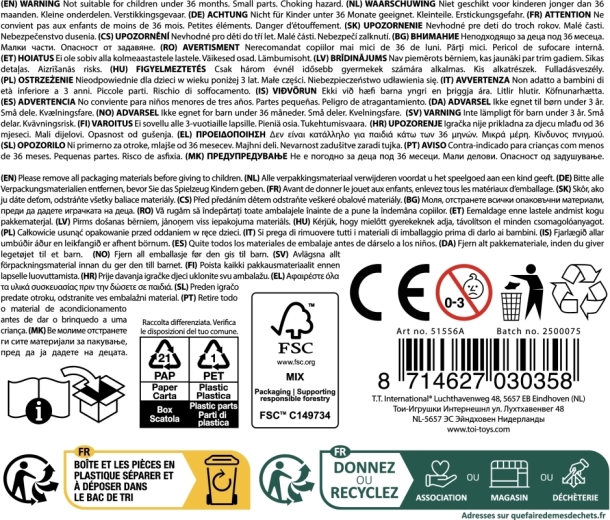 W opakowaniu znajduje się wszystko, czego potrzebujesz do gry: podstawa (beczka), głowa dinozaura, 16 ognistych patyczków oraz arkusz naklejek do wykończenia detali. Solidne plastikowe elementy z gładkimi krawędziami są odpowiednie dla małych dziecięcych dłoni. Gra rozwija motorykę, cierpliwość i spostrzegawczość i jest idealna na rodzinne wieczory lub dziecięce przyjęcia.