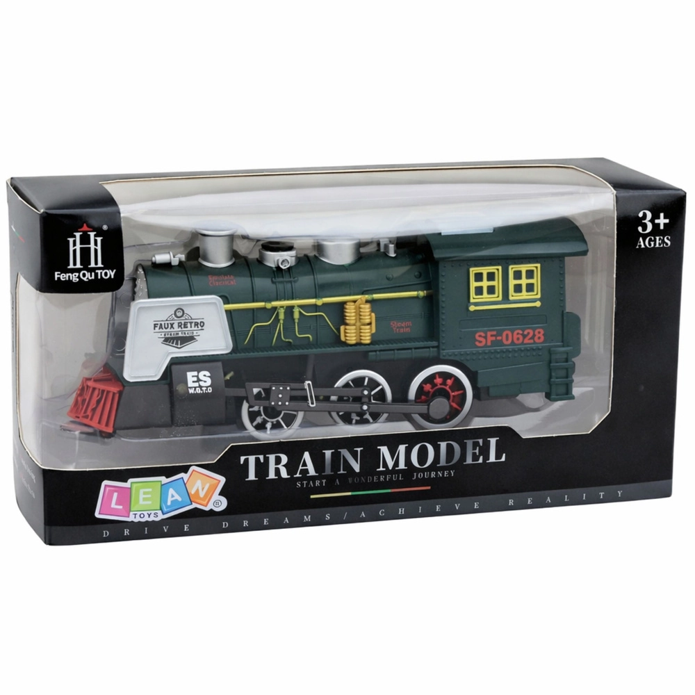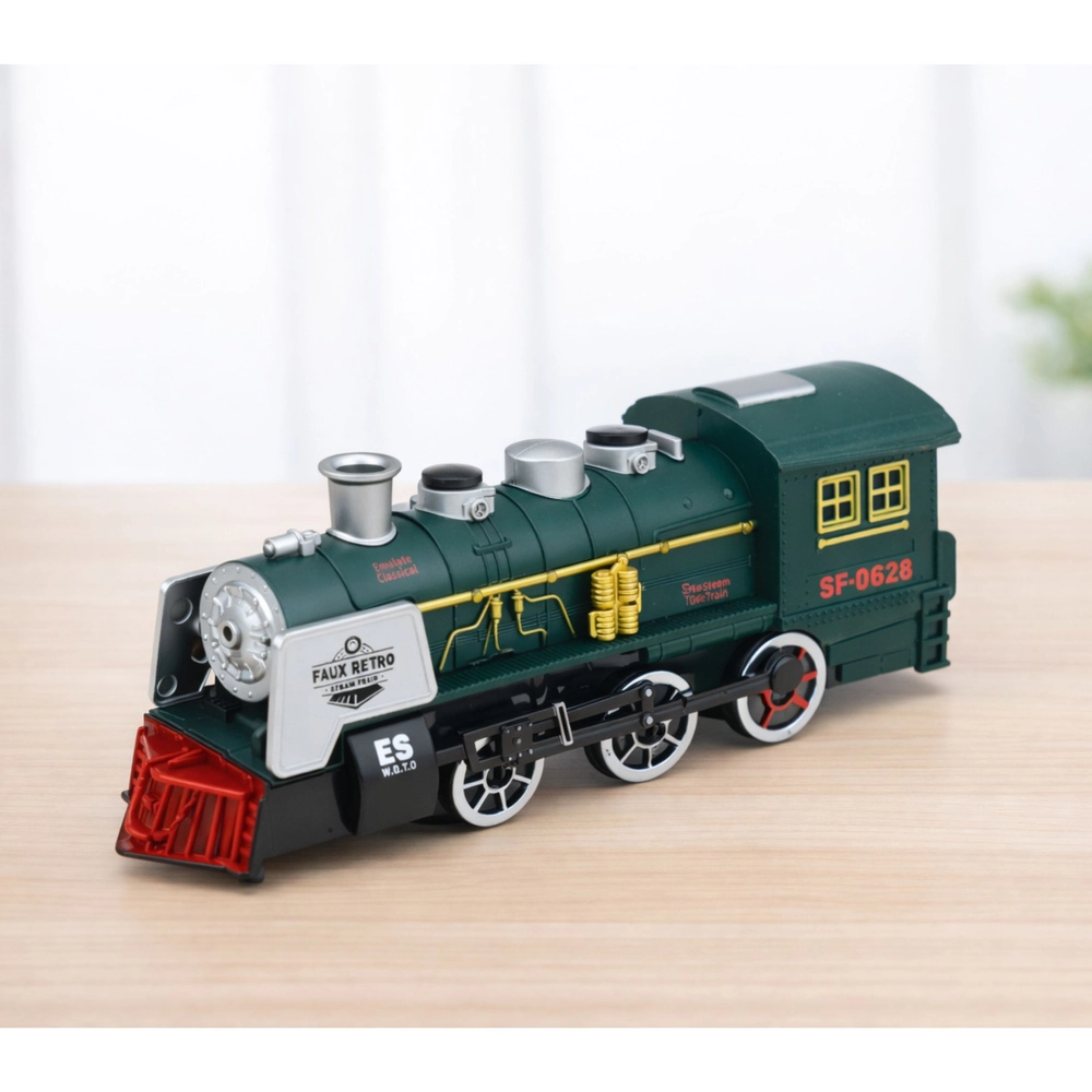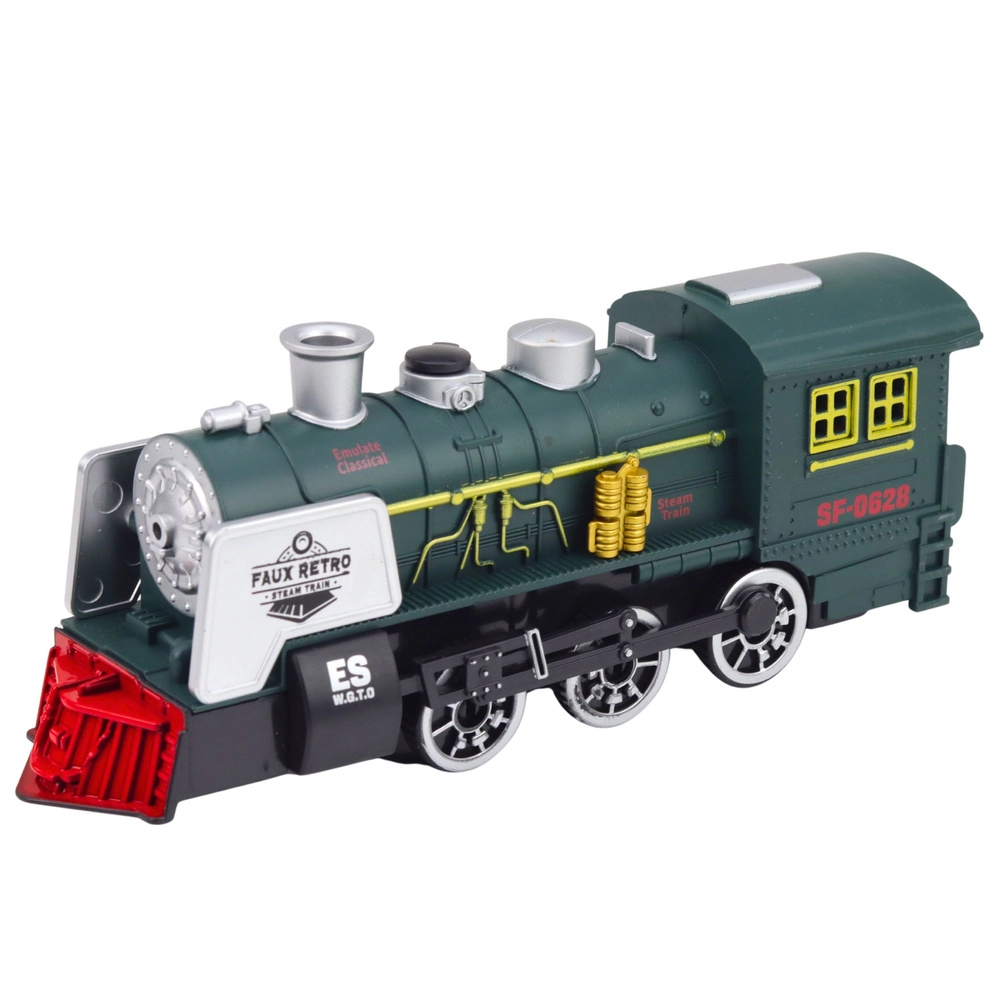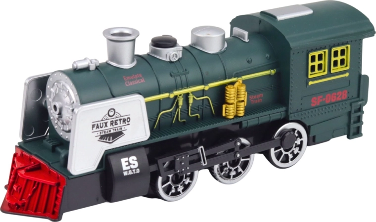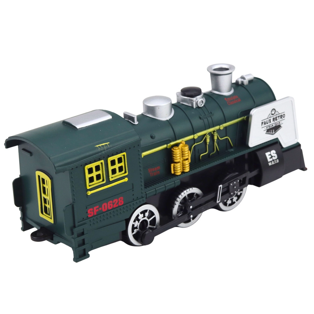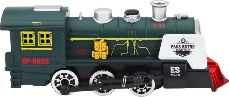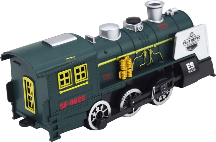 Realistycznie wykonana zielona lokomotywa parowa inspirowana tradycyjnymi parowozami oferuje efekt dymu, efekty świetlne i dźwiękowe oraz inteligentny czujnik przeszkód, który automatycznie zmienia kierunek jazdy. Szczegółowe wykonanie kół, komina i bocznych elementów zapewnia autentyczny wygląd i świetną zabawę dla małych miłośników pociągów.