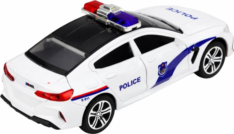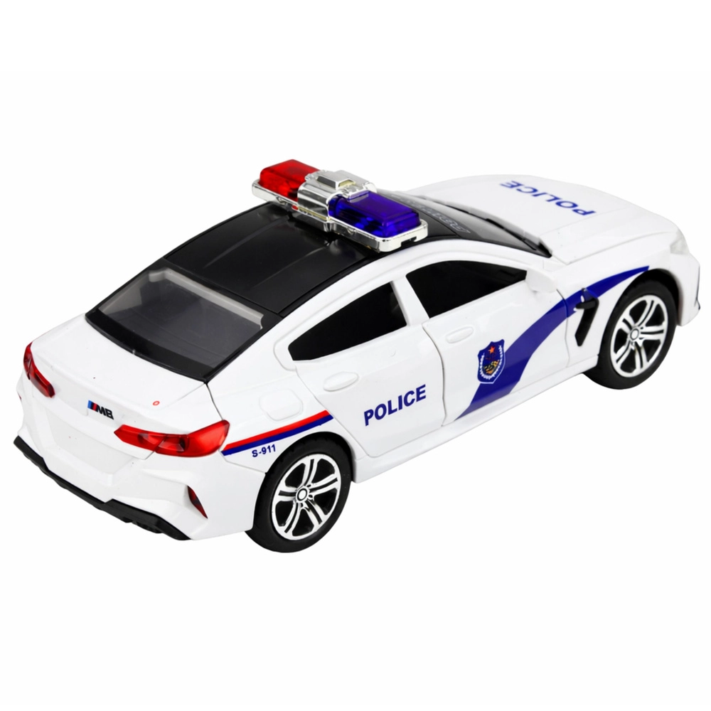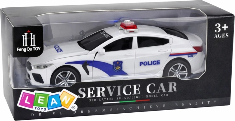Realistyczny biały radiowóz zapewnia emocjonującą zabawę dzięki efektom świetlnym i dźwiękowym, otwieranym przednim drzwiom oraz mechanizmowi napędu do jazdy do przodu po popchnięciu. Dopracowane detale z napisami POLICE, czerwono-niebieskim kogutem i wytrzymałym wykonaniem ucieszą małych miłośników pojazdów służbowych.