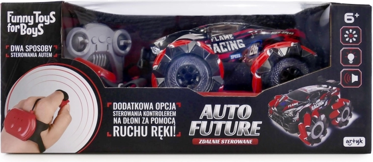 Doświadcz nowego poziomu zabawy z RC autem Future sterowanym ręką. Oferuje 2 sposoby sterowania – klasycznym pilotem lub zegarkiem/gestami, ma pełny zakres jazdy, potrafi jeździć także bokiem, szczyci się futurystycznymi kołami, podświetlaną karoserią oraz wbudowaną muzyką.