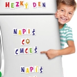 Magnetyczne kolorowe literki odpowiednie na lodówkę, pralkę lub jakąkolwiek inną metalową powierzchnię. Zestaw zawiera 100 liter alfabetu czeskiego, które pozwolą dzieciom tworzyć słowa i zdania, a także wiadomości dla członków gospodarstwa domowego.