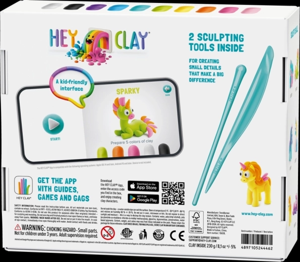 W zestawie znajduje się kod dostępu do aplikacji mobilnej HEY CLAY, która oferuje animowane instrukcje krok po kroku. Dzieci w zabawny sposób uczą się kształtować poszczególne elementy i składać je w gotowe figurki. Dwa dołączone narzędzia ułatwiają modelowanie detali i faktur.