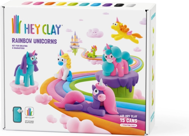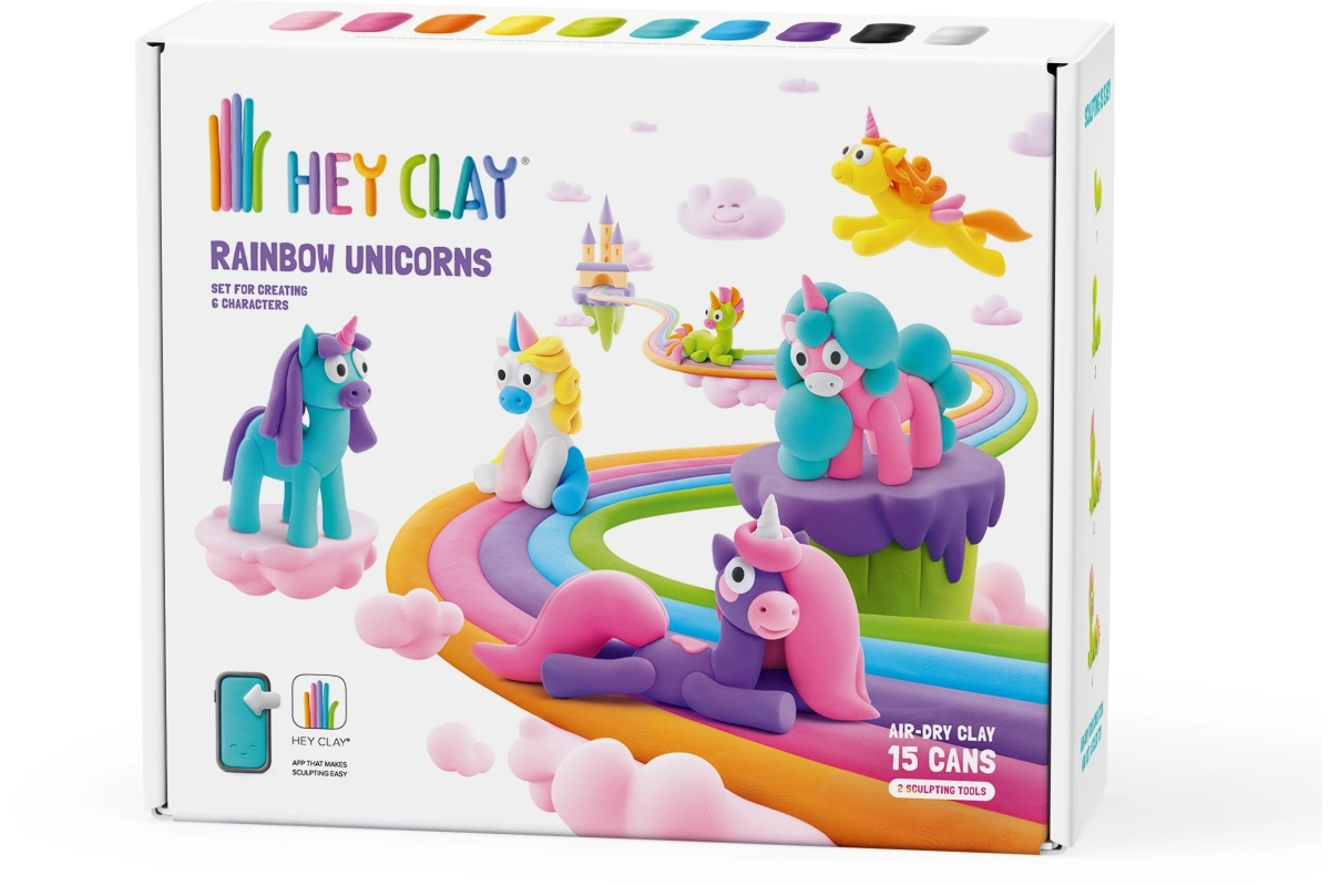 Zestaw Hey Clay – tęczowe jednorożce to wesołe wejście do świata modelowania dla małych i dużych twórców. Miękka, gładka i łatwa w formowaniu masa w żywych kolorach po zakończeniu samoczynnie utwardza się na powietrzu, dzięki czemu dzieci mogą zachować i wyeksponować swoje dzieła.
