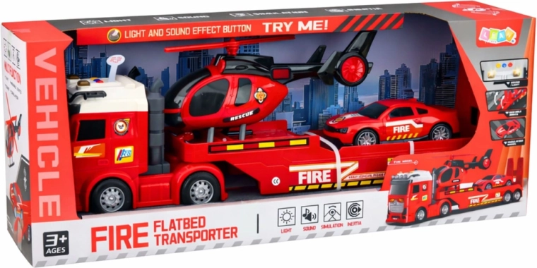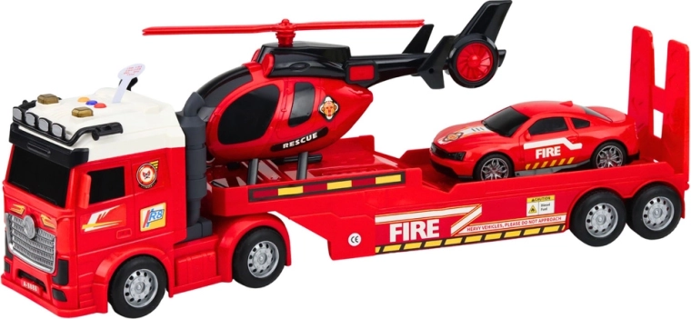 - Zestaw strażacki: ciężarówka z platformową naczepą, helikopter, samochód strażacki