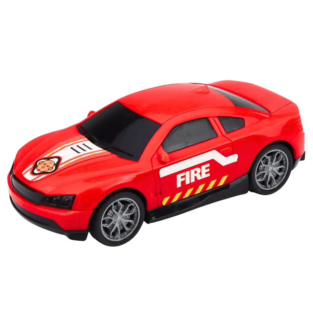 Kompaktowy pojazd z wyraźnymi napisami FIRE i kołami na wolnym biegu uzupełnia zespół o szybką jednostkę do przemieszczania się po mieście.