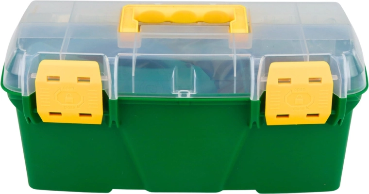 Przezroczysta pokrywa, solidne zatrzaski i uchwyt ułatwiają przenoszenie oraz przejrzyste przechowywanie wszystkich narzędzi w jednym miejscu.